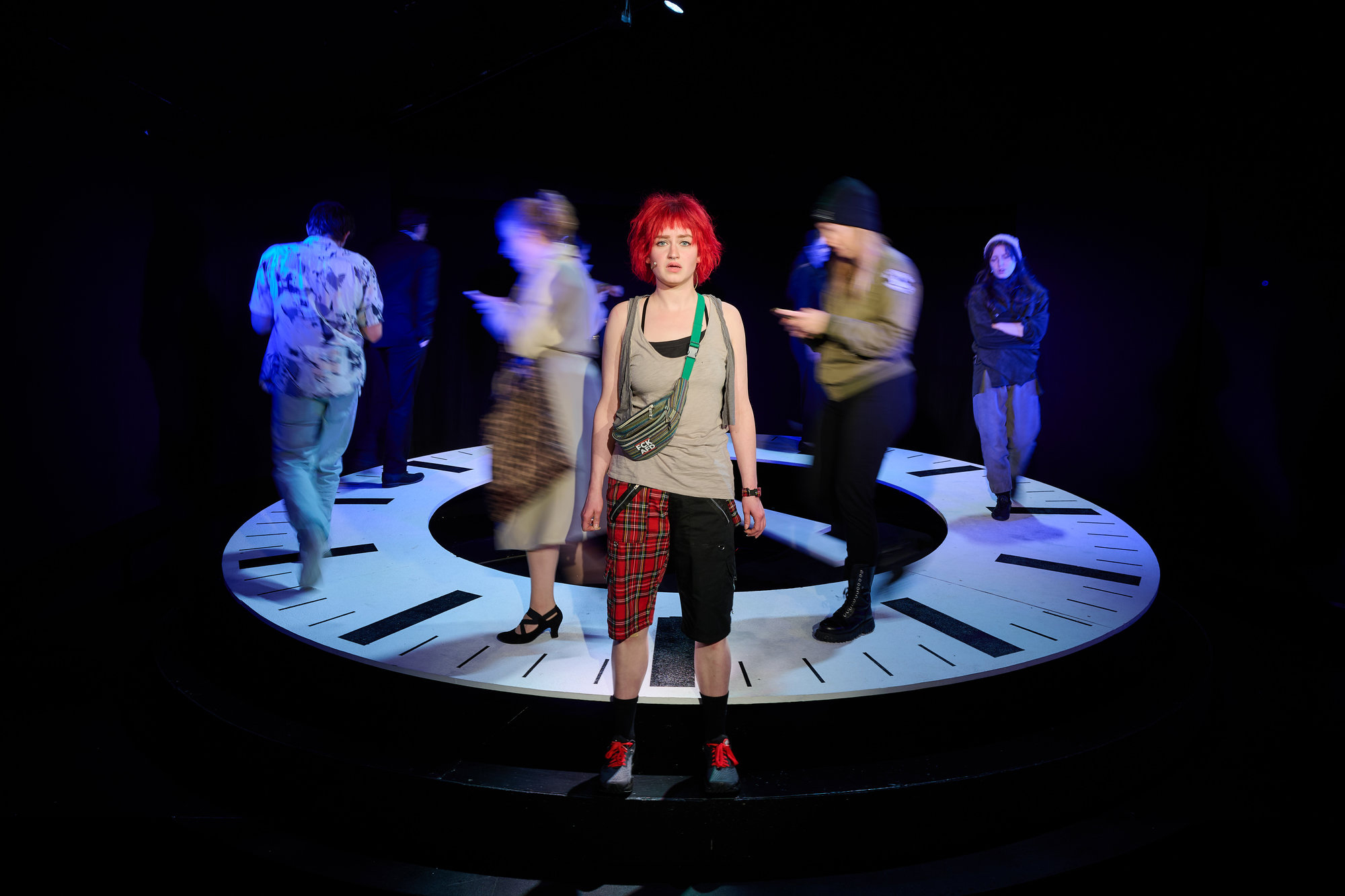 Eine riesige Uhr dreht durch, Menschen laufen im Kreis, die Augen starr auf ihre Handys gerichtet. Gitarrenrhythmen treiben die Szene an. Das Ensemble stimmt den Queen-Klassiker an: "Pressure pushin' down on me, pressin' down on you …" So beginnt das Theaterstück "Lola rennt".
