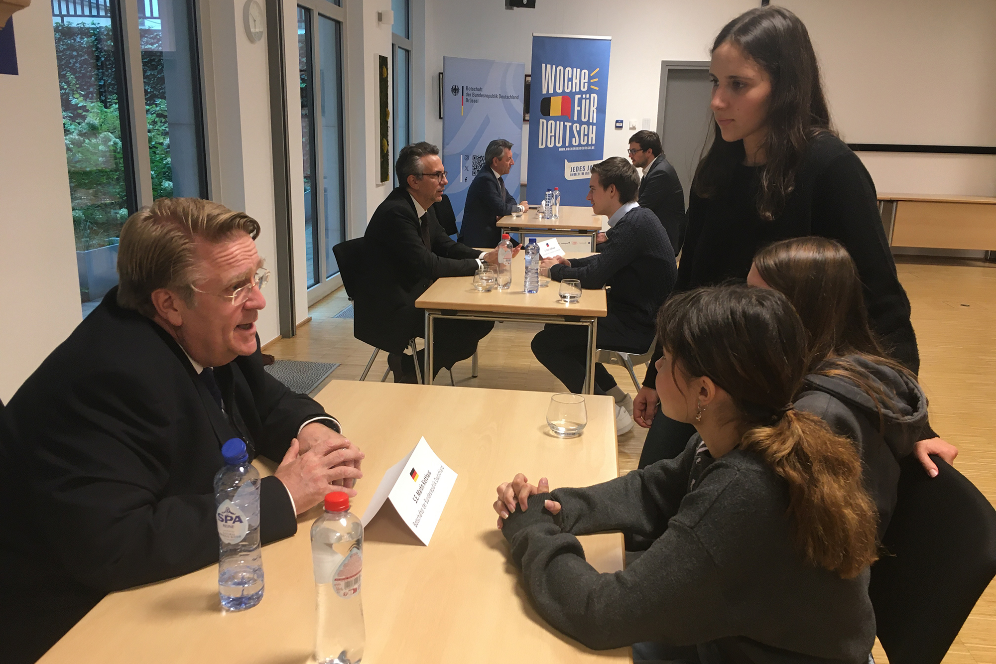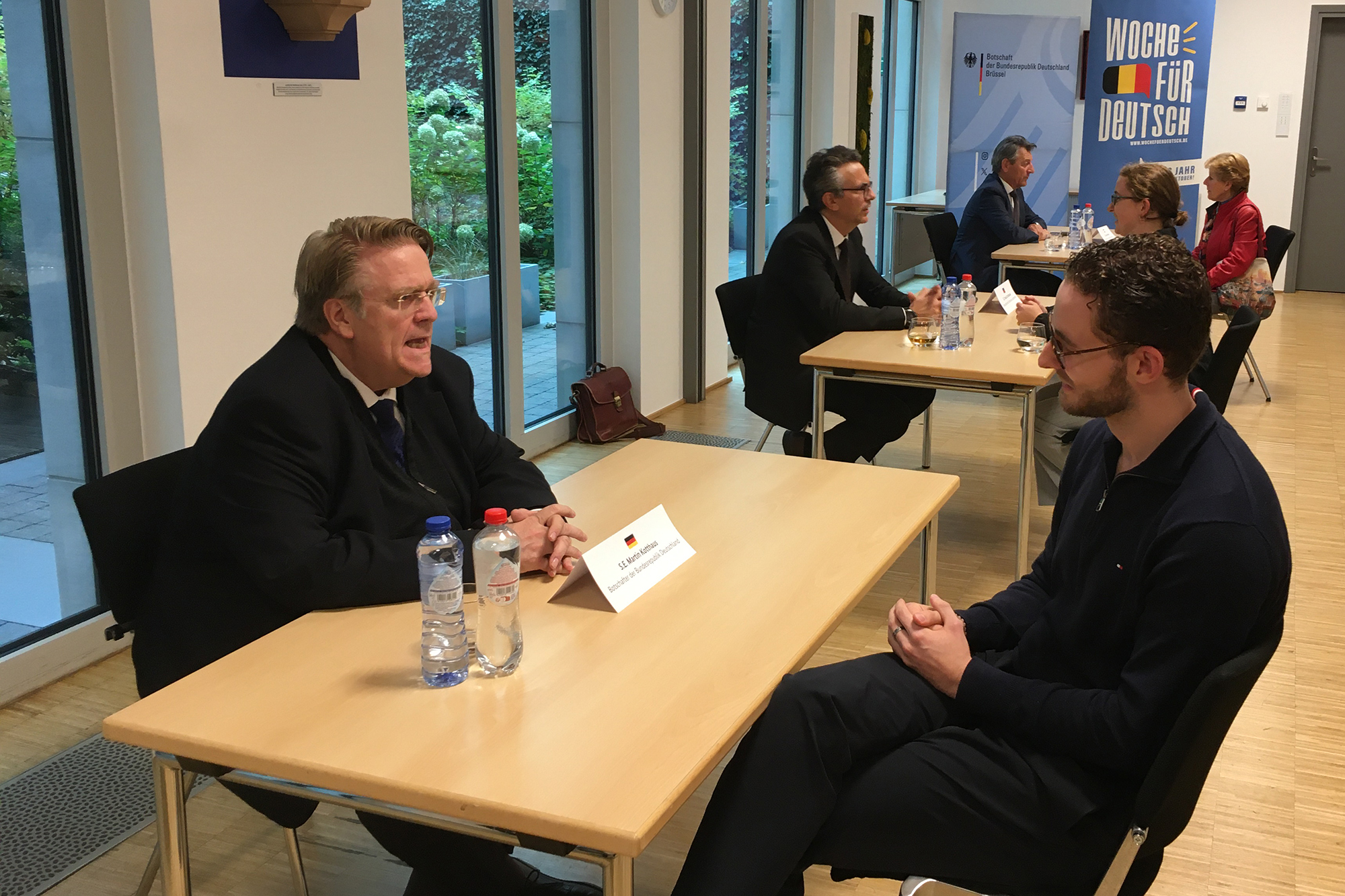 Sechs Tische, fünf Herren, eine Dame und jeweils fünf Minuten Zeit, um sich mit diesen Herren und der Dame über alles zu unterhalten, was man wollte: Dieses Szenario erwartete die Interessenten, die am späten Mittwochnachmittag in den Veranstaltungssaal der Deutschen Botschaft in Brüssel gekommen waren.