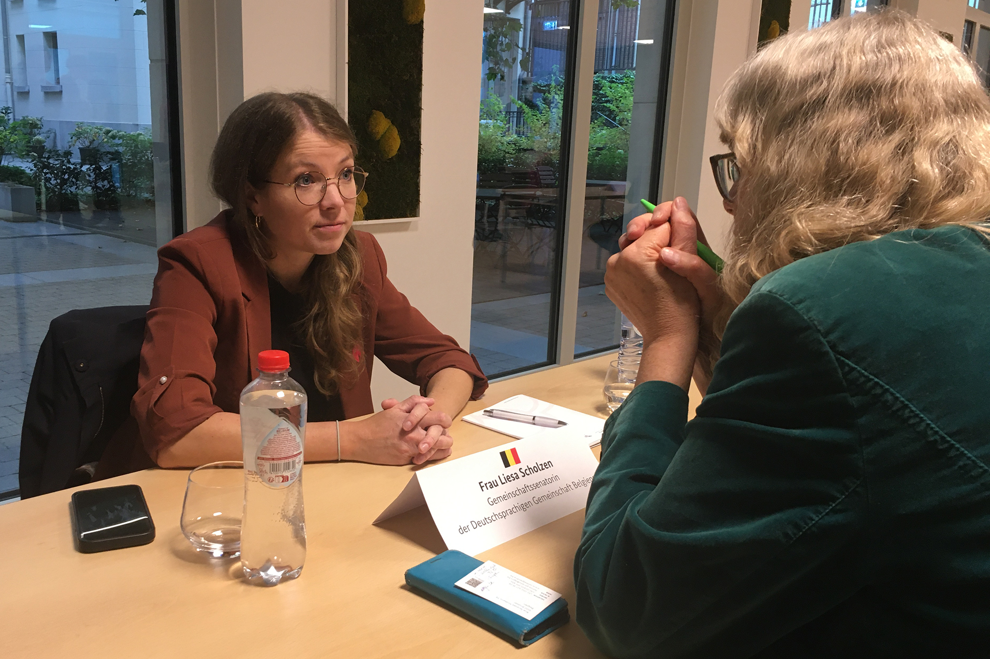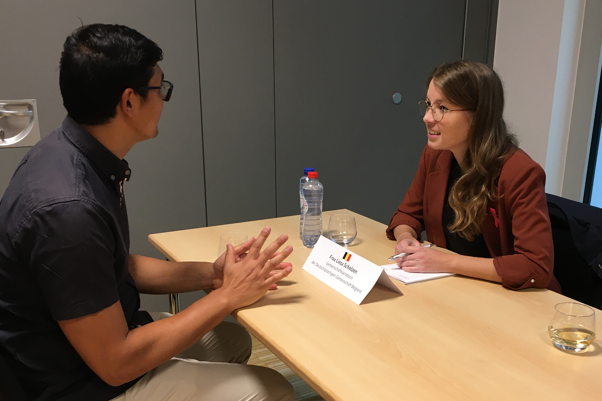Bei Senatorin Liesa Scholzen erkundigten sich viele Teilnehmer über verschiedene Aspekte der DG und der deutschen Sprache in Belgien. Wie zum Beispiel Kevin aus Oldenburg und Sophie aus Jena, die beide zurzeit in Belgien arbeiten und wohnen.