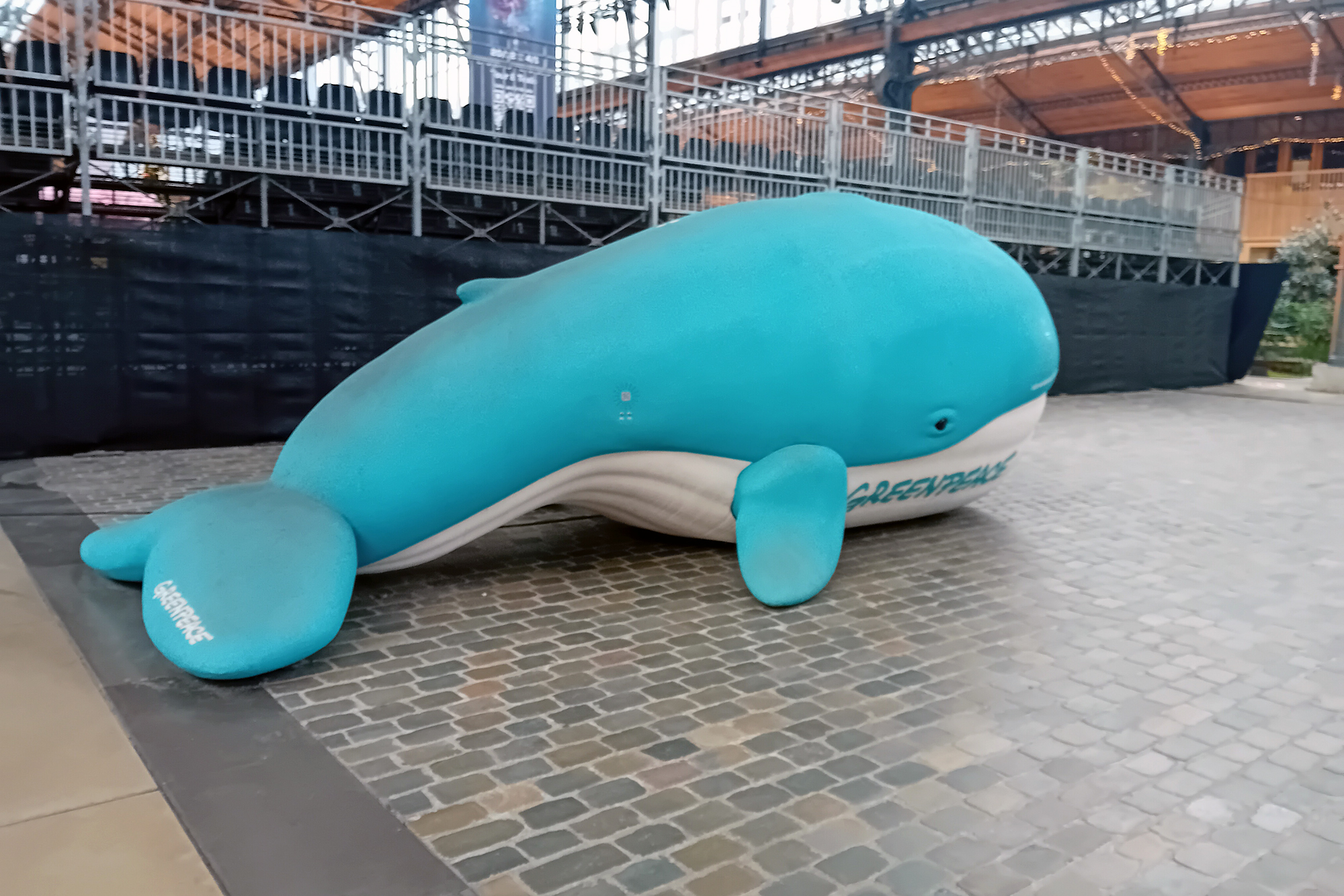 Es passiert wohl eher selten, dass man von einem Walfisch von der Seite angequatscht wird. Schon gar nicht von einem, der an ein riesiges Plüschtier erinnert. Aber Walter der Wal, beziehungsweise auf Französisch Bernard la baleine, ist natürlich kein echter Blauwal. Es handelt sich um ein Modell der Umweltschutzorganisation Greenpeace.