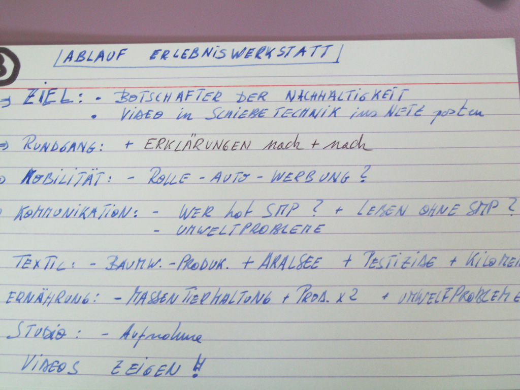 Die gesammelten Erfahrungen werden gemeinsam ausdiskutiert und sollen mit einem Clip veranschaulicht werden, der dann am Ende des Workshops abgedreht wird. Mit dem Projekt will die Verbraucherschutzzentrale langfristig die Botschaft der Nachhaltigkeit vermitteln.