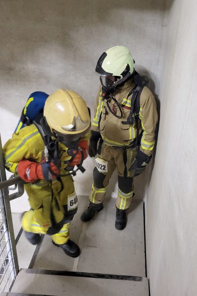 Insgesamt 707 Stufen müssen bis nach ganz oben gemeistert werden. Einmal aus der Staumauer raus geht es einige Meter hin zum engen Betontreppenhaus des Aussichtsturms, wo der schwierigste Teil zu bewältigen ist. Das Atmen mit Maske und Atemluftflasche ist eine Zusatzbelastung. Die meisten Feuerwehrleute gehen ans Limit. Der beste Beweis: Das Dauerpiepsen, das zeigt, dass die Atemluftflasche auf Reserve läuft. Aber fast jeder der Teilnehmer schafft es.