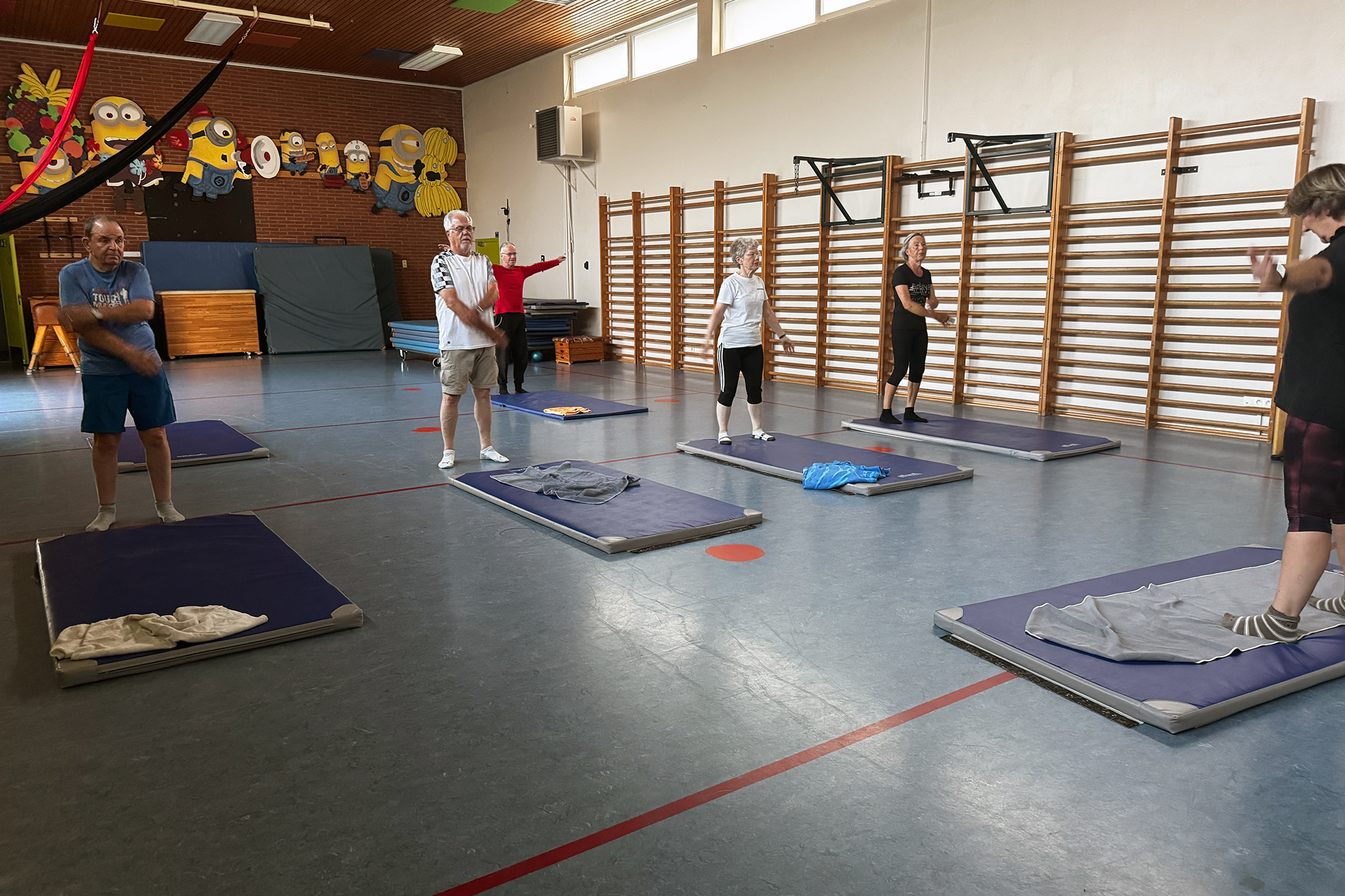 Trainerin Heidi Lausberg bereitet die kleine Sporthalle vor für das Gesundheitsturnen, das auf dem Programm steht. Heute ist es warm, da werden wohl nicht so viele zur Turnstunde kommen. Sieben Matten legt sie aus und Heidi liegt mit ihrer Prognose fast richtig. Pünktlich um 19 Uhr geht es los.