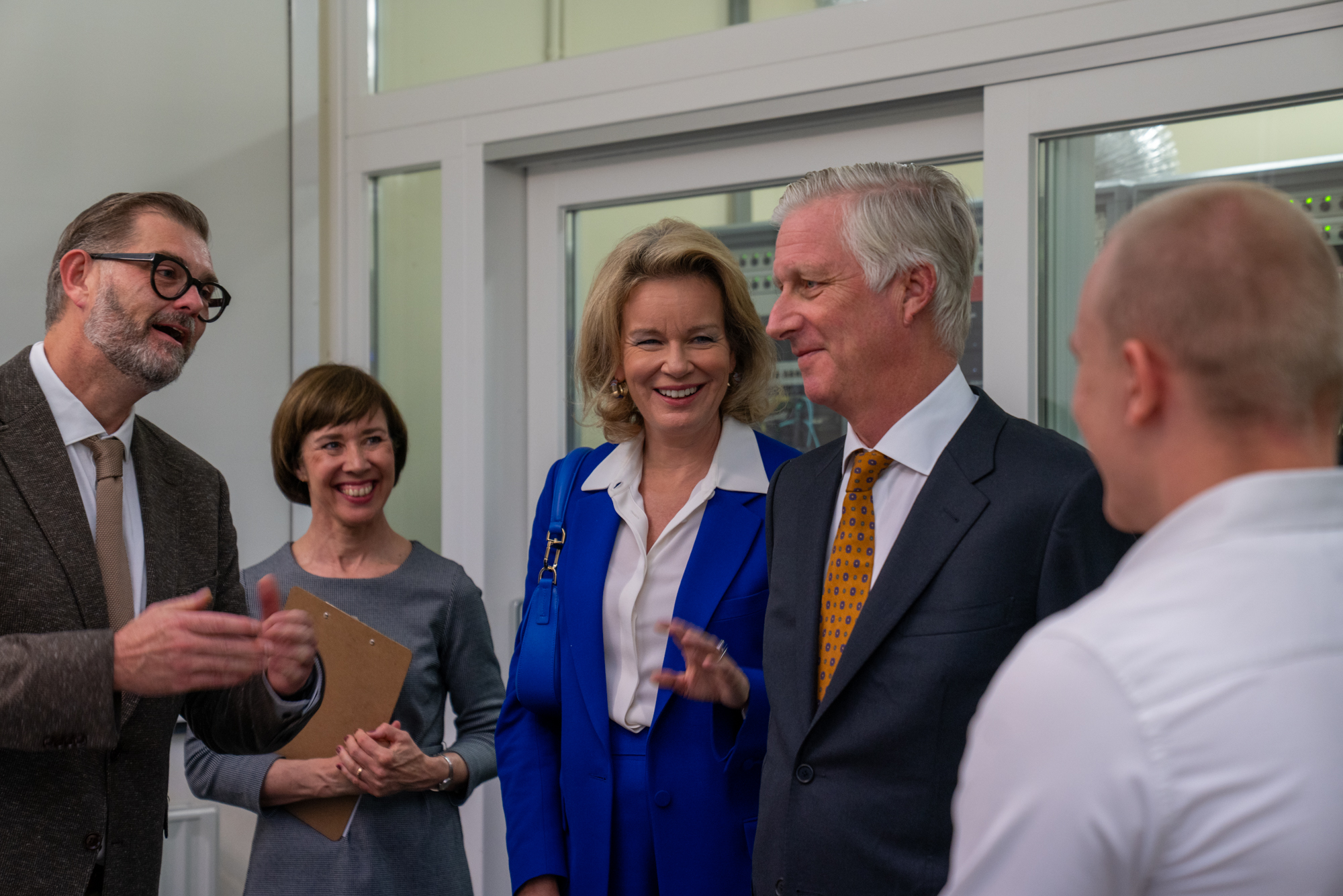 Rund anderthalb Stunden brachten König Philippe und Königin Mathilde mit, um das Funkhaus und sein Personal kennenzulernen. Im Foyer stellte BRF-Direktor Alain Kniebs den Gästen zunächst das Haus vor und gab ein paar Einblicke in die digitale "Zeitreise" ins BRF-Archiv.