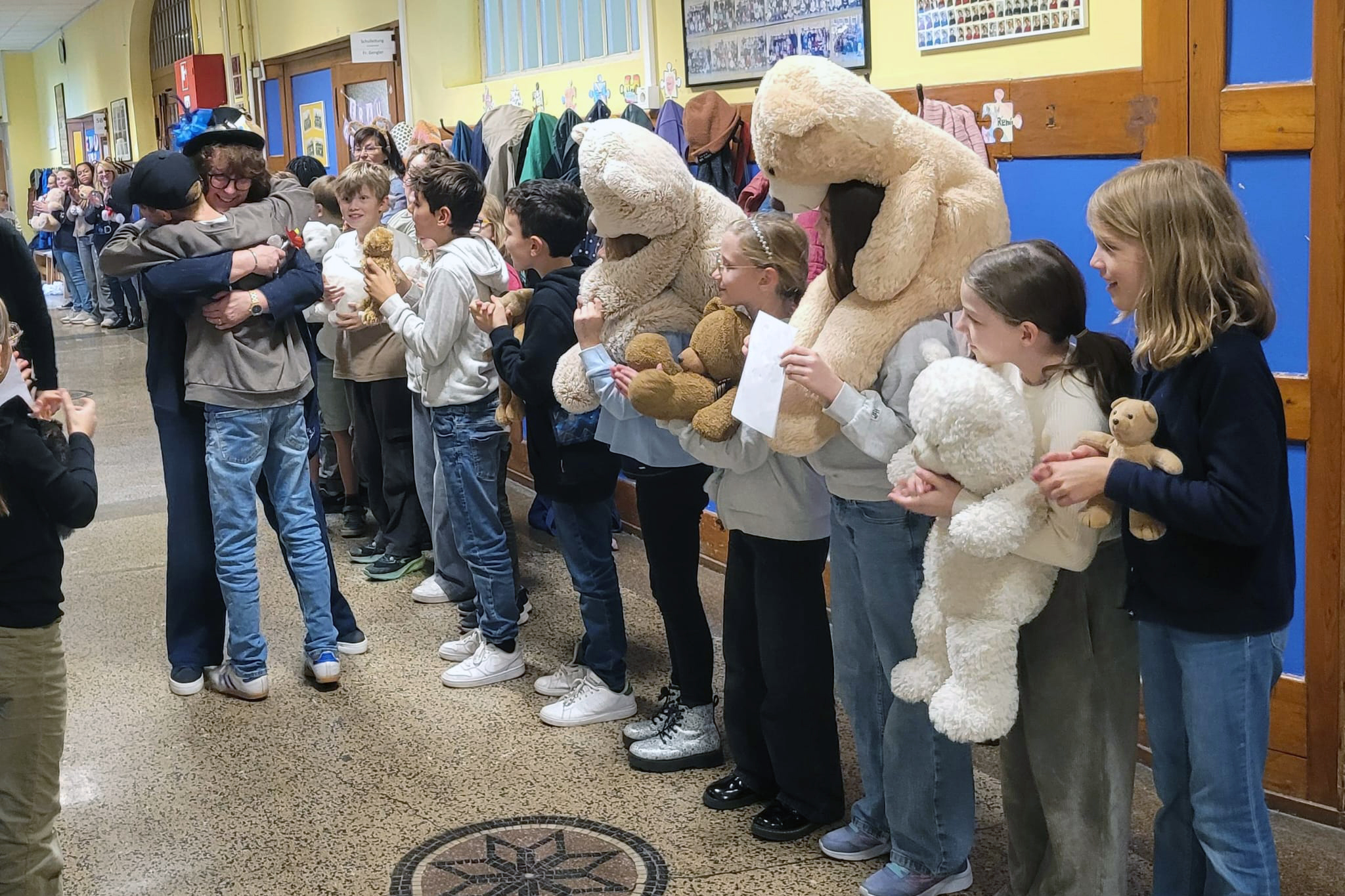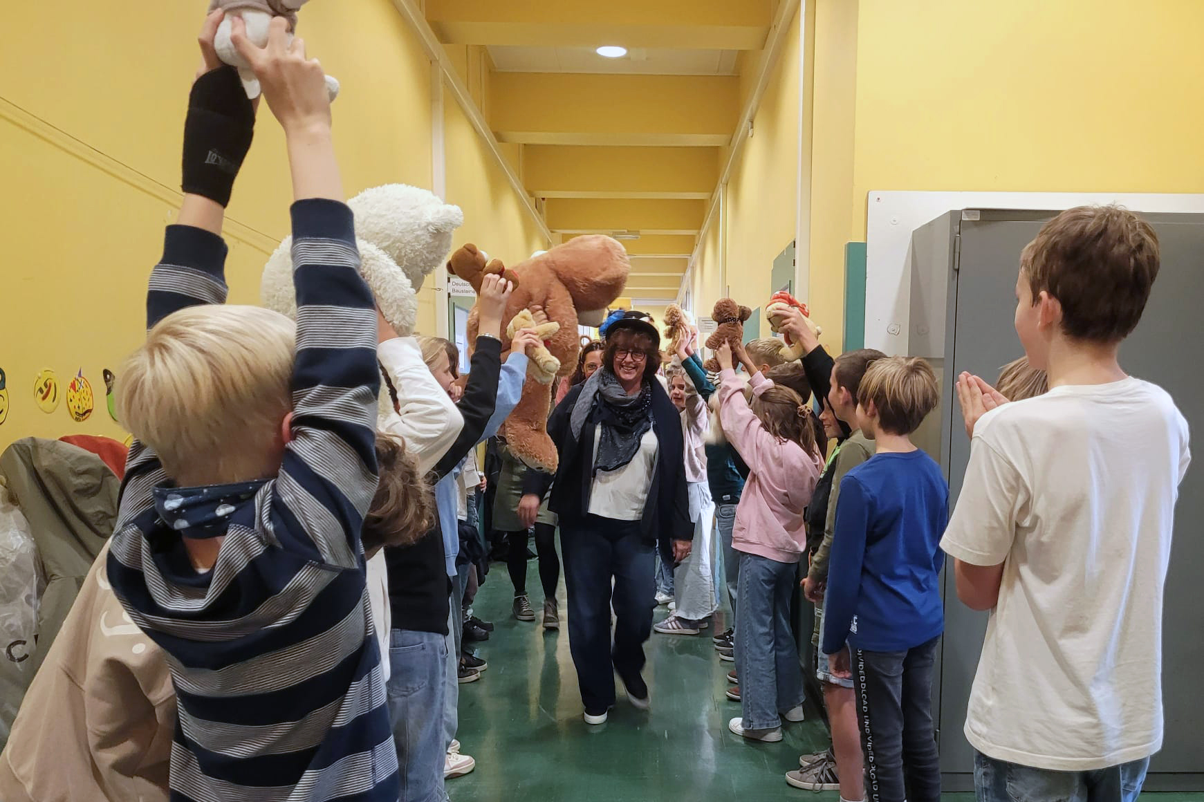 Auf den Fluren der Pater-Damian-Grundschule stehen Kinder und Lehrer angereiht. In den Händen halten sie kleine Teddybären. Die Lehrer tragen Bärenohren. Es wird gejubelt und gelacht. Sie feiern den Abschied der ehemaligen Direktorin Maria Herzet-Lebrun. "Ich wusste natürlich, dass irgendetwas kommen würde, aber ich wusste nicht was. Die haben das so geheim gehalten, was die Kinder gemacht hatten. Ich wusste nichts. Ich bin den Kindern unheimlich dankbar, vor allen Dingen auch meinen Kollegen, die da mit viel Herzblut und viel Begeisterung und Kreativität an den Tag gegangen sind. Das war sehr schön."