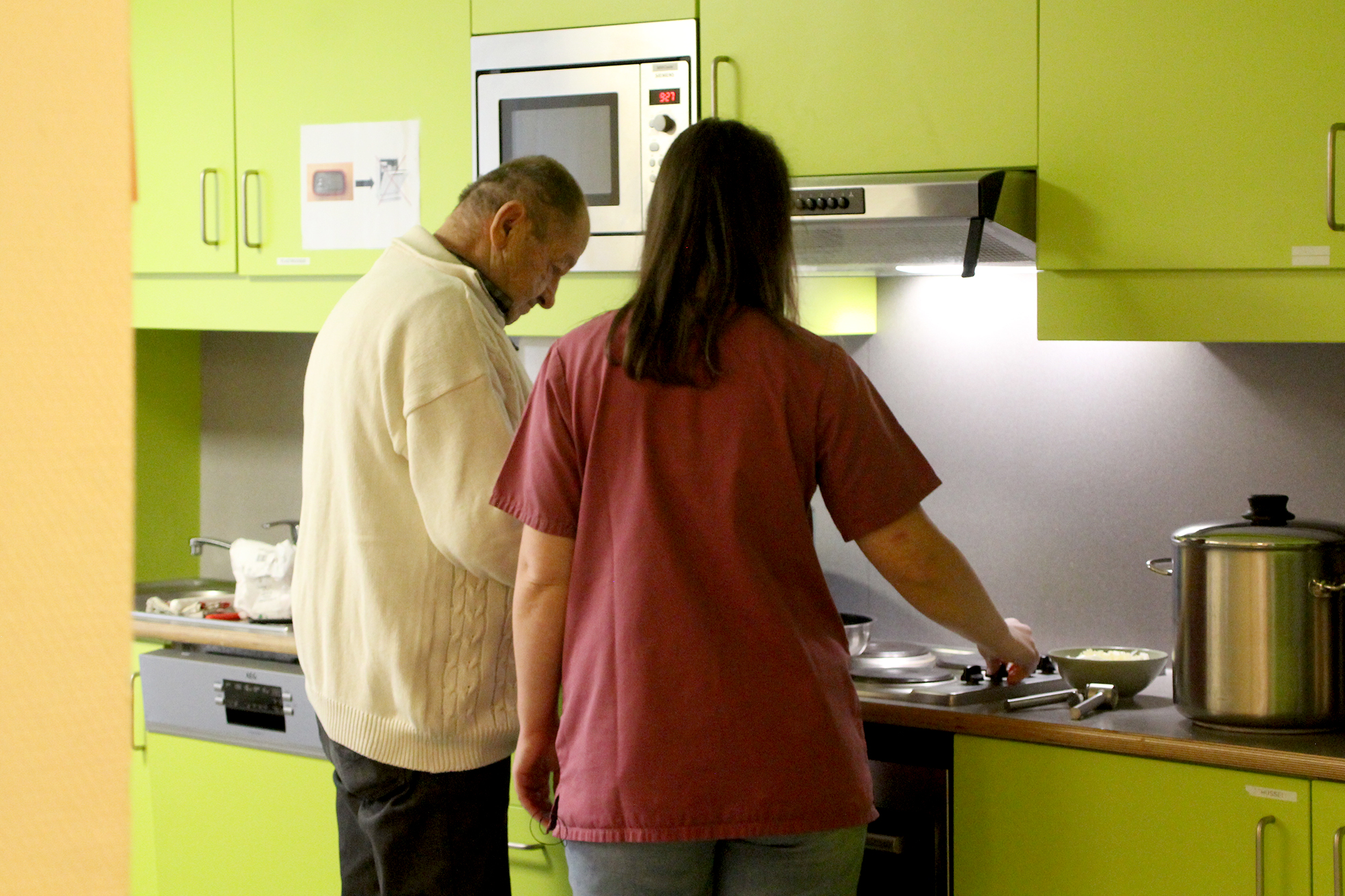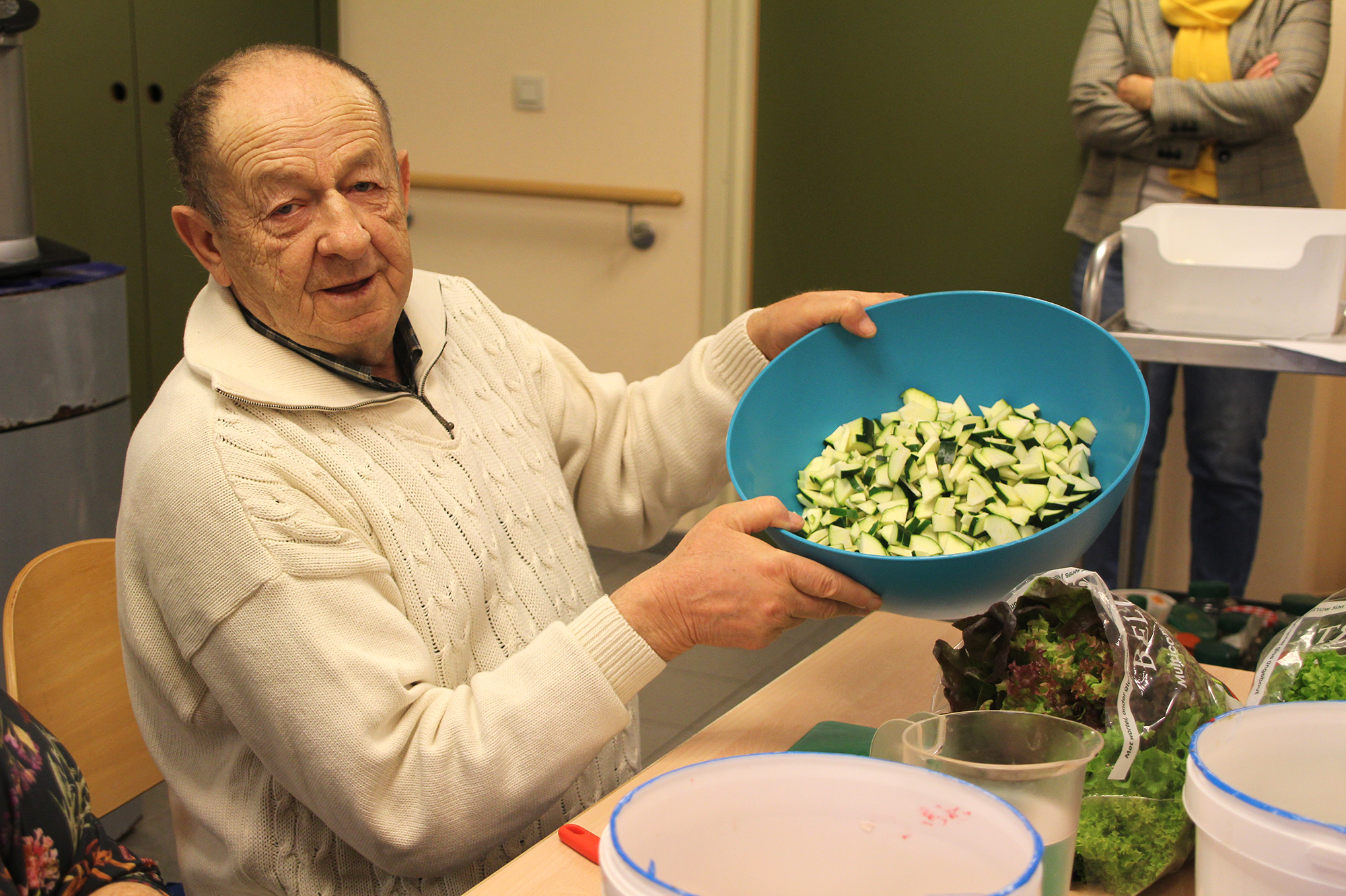 In der Küche des Haus Vitus wird fleißig geschnippelt. Auf dem Speiseplan steht Chilli Con Carne. Die Bewohner kümmern sich um die Beilagensalate. Das Kochen ist eine der vielen Aktivitäten, an denen sie jeden Tag teilnehmen können.