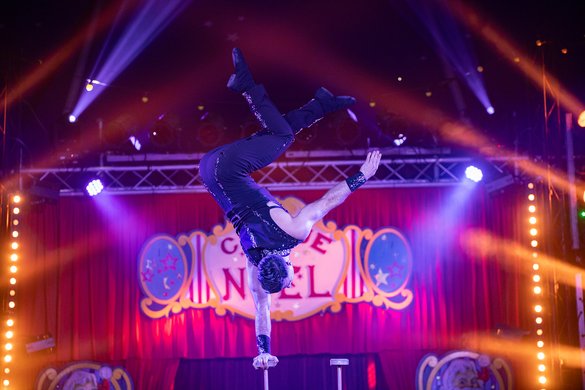 Die Besucher des Aachener Weihnachtscircus betreten das große Zelt auf dem Bendplatz. An den Seiten stehen schon die geschmückten Tannenbäume. Ein Mann steht in der Manege und jongliert. In der Luft tanzen Trapez-Künstler. Das Publikum jubelt und es duftet nach leckerem Weihnachtsgebäck und Printen.