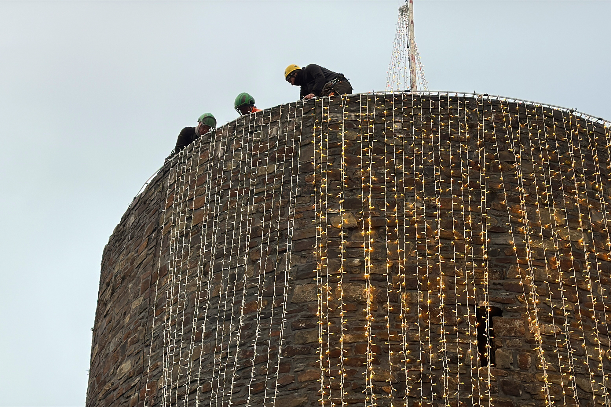 Hinzu kommen dann noch mal 675 Lämpchen für den Tannenbaum, der oben auf der Spitze thront. Der Baum ist in diesem Jahr nur aus LED-Lichterketten, die am Fahnenmast befestigt wurden, auf einen richtigen Tannenbaum wurde verzichtet. Das erleichtert die Arbeit für das Team immens und abends wird er genau so schön leuchten wie sonst auch.