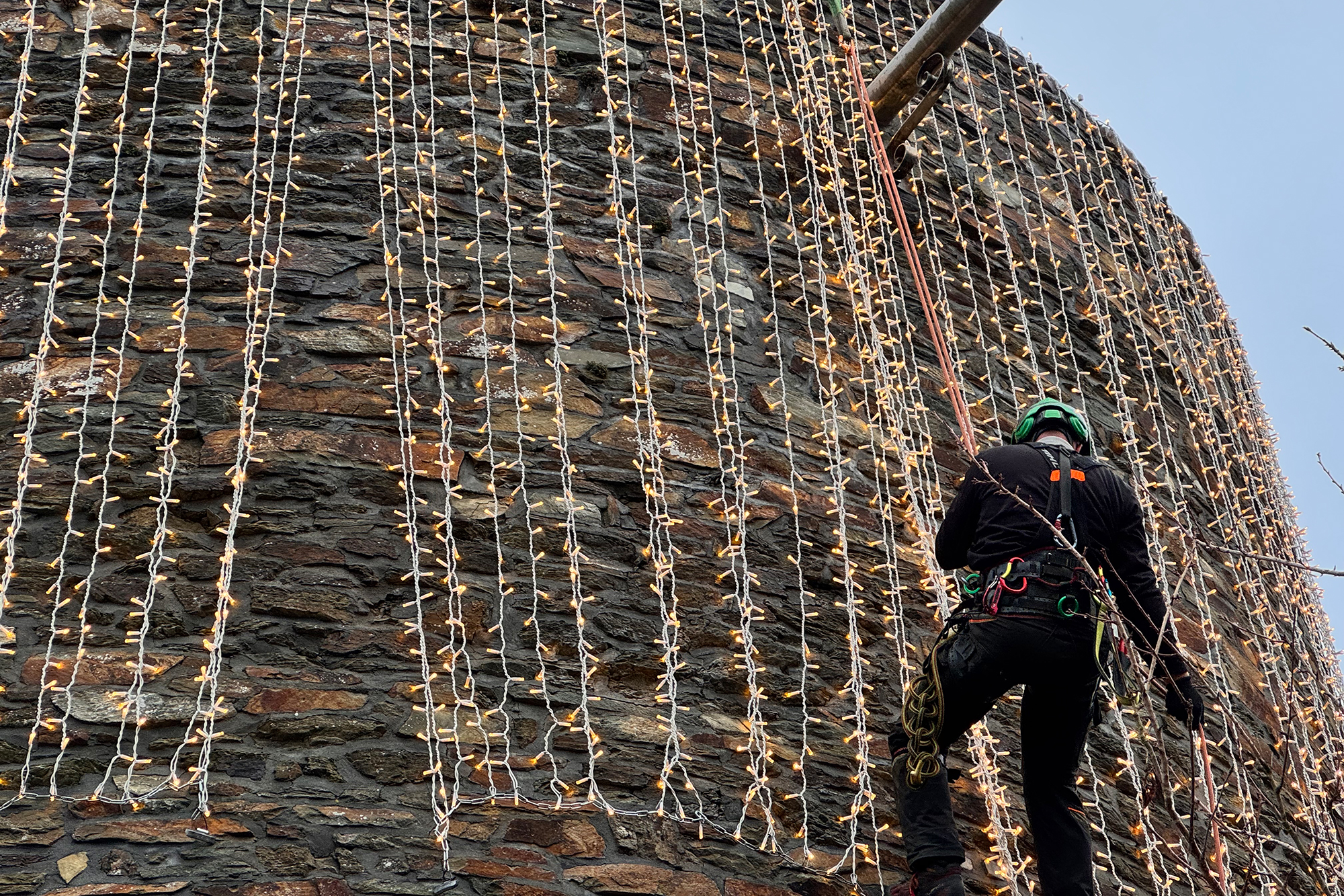 David Mertes und seine zwei Kollegen von der Grünkolonne bereiten sich auf einen etwas anderen Arbeitstag vor. Seit vier Jahren geht es in den Tagen vor dem ersten Advent rauf auf den Büchelturm, um dort Lichterketten anzubringen, die man von Weitem sehen kann. Die drei wissen genau, was sie tun. Gut gesichert geht es schnell ran an die erste Bahn.