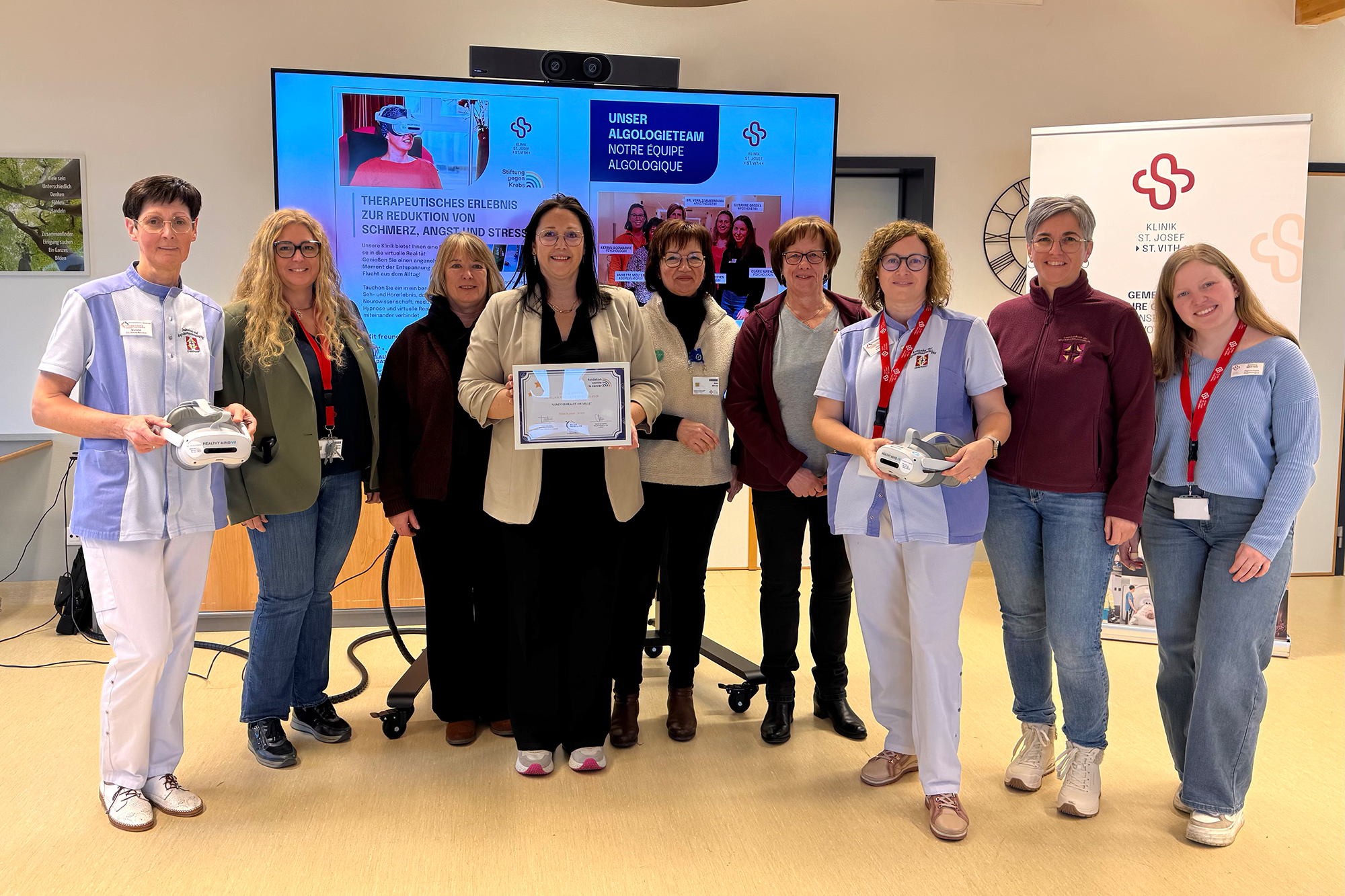Seit 2022 gibt es die VR-Brillen in der Klinik in St. Vith. Dank einer Spende der Stiftung gegen Krebs letzten November konnte die Klinik zwei weitere anschaffen. Die Therapie mit den Brillen machen Freiwillige. Sie arbeiten mit dem Pflegepersonal zusammen und bringen die Zeit mit, die im Krankenhausalltag oft fehlt. Eine von ihnen ist die Rentnerin Mariette Diederen-Reusch: "Die Patienten sind froh, wenn wir reinkommen. Es werden oft sehr persönliche Gespräche geführt. Das ist wirklich eine Bereicherung und sehr positiv."