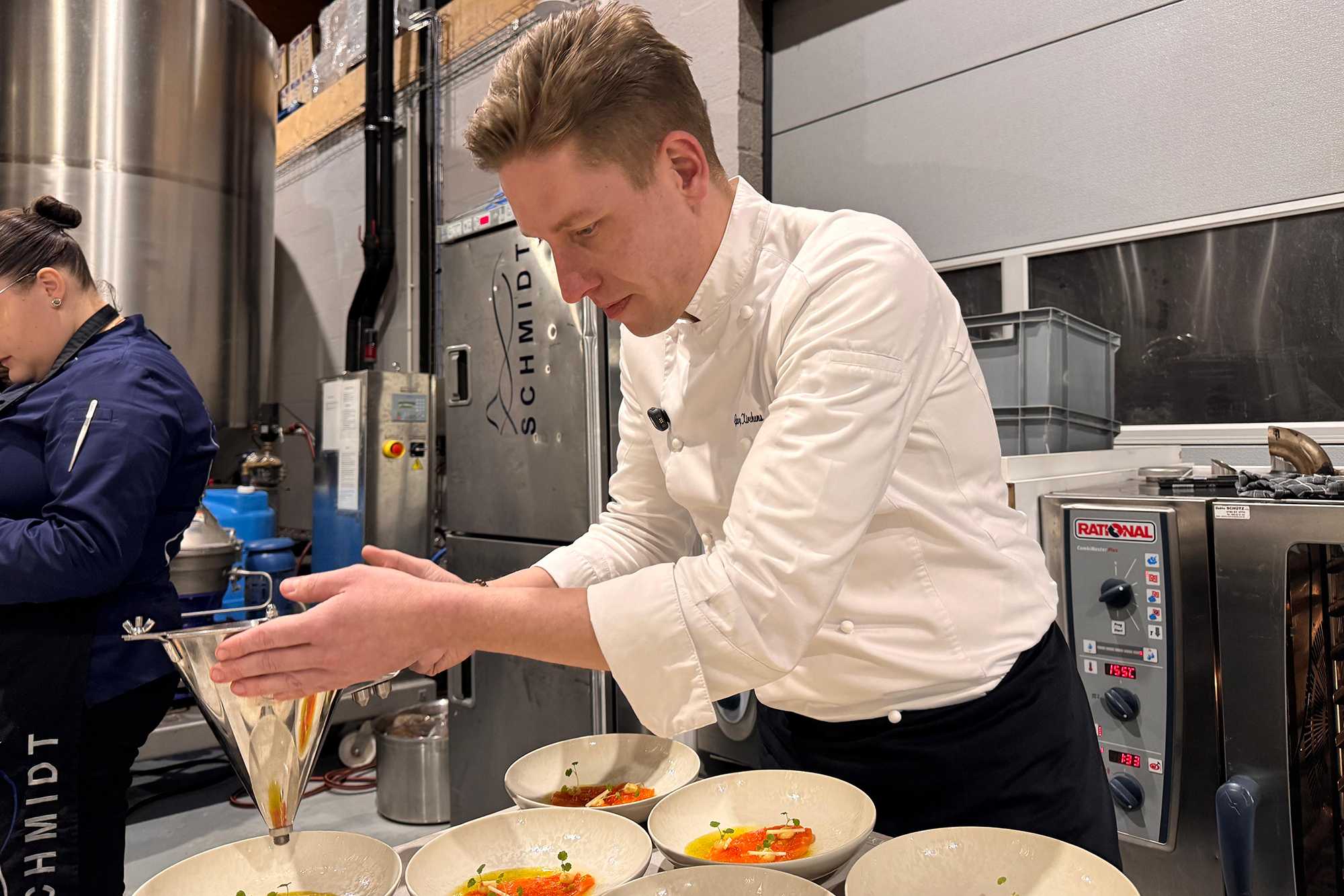 Es war ein gelungener Abend, sagt Sternekoch Eric Pankert. Der St. Vither Sternekoch war für den Nachtisch zuständig, eine moderne Interpretation des Birnendesserts "Belle Hélène". "So viel Sabayon auf einmal habe ich noch nie geschlagen. Wir waren zwar zu dritt, aber ich bin froh, dass ich es hinter mir habe."