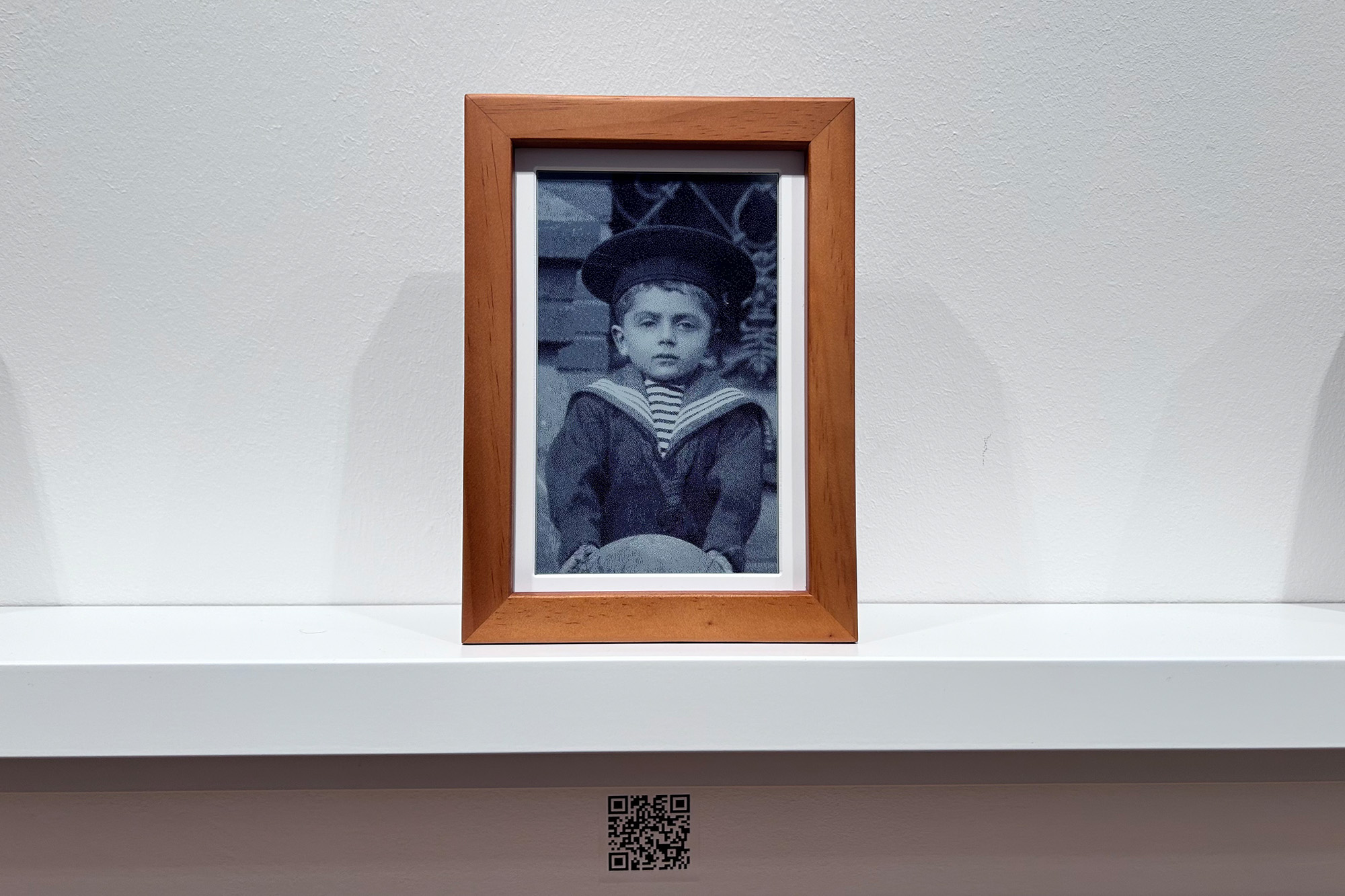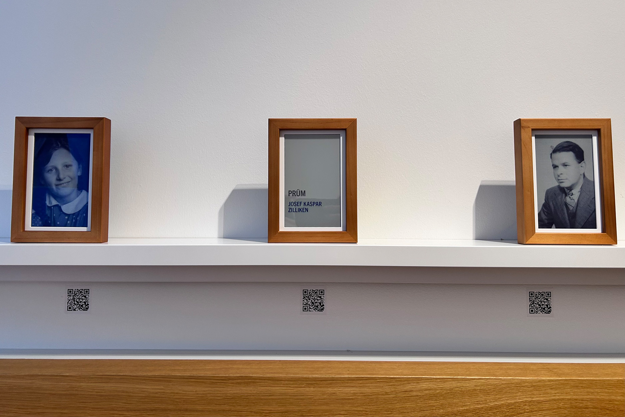 Die Tür im Besucherzentrum führt in einen kleinen Raum. Das Licht ist warm, die Wände weiß und die langen Bänke aus Holz. Im ganzen Raum hängen weiße Regale über den Bänken. Darauf befinden sich Holzbilderrahmen. Sie zeigen Namen und Fotos, die nach einer Zeit wieder verschwinden. Gleich am Eingang stehen zwei digitale Tafeln mit Biographien. Gegenüber wird eine Ortskarte an die Wand projiziert.