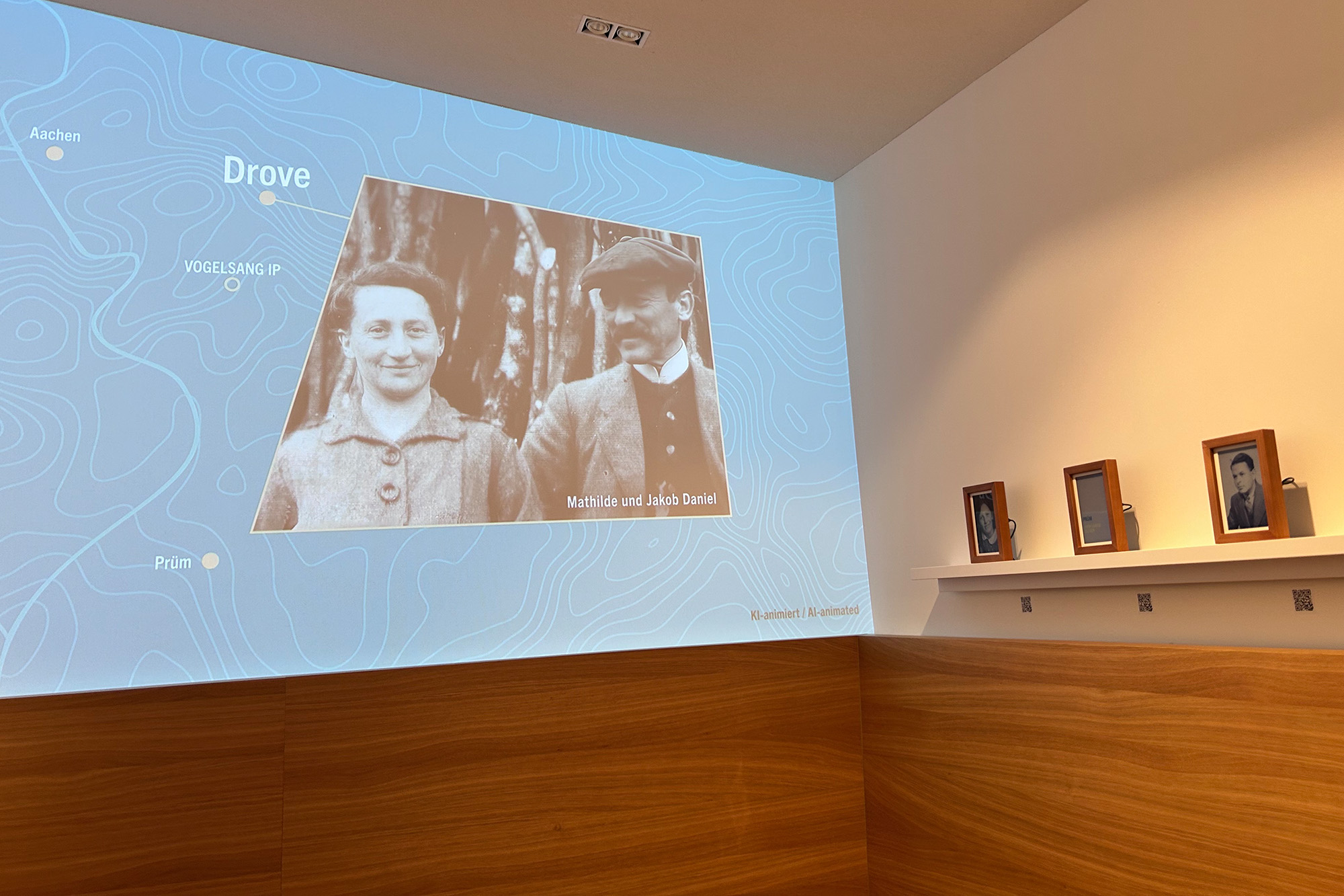 In einer ruhigen Atmosphäre kann man hier Menschen kennenlernen, die zu Opfern der NS und beinahe vergessen wurden. "Die Bilderrahmen sind eine bewusste Auswahl, um den Menschen hier ein Gesicht zu geben", sagt Thomas Kreyes, Geschäftsführer der Vogelsang IP. "So ein bisschen wie man es zu Hause mit seinen Liebsten macht, wo man sich auch so einen Holzbilderrahmen in die Wohnung stellt, um diese Menschen immer wieder zu sehen."