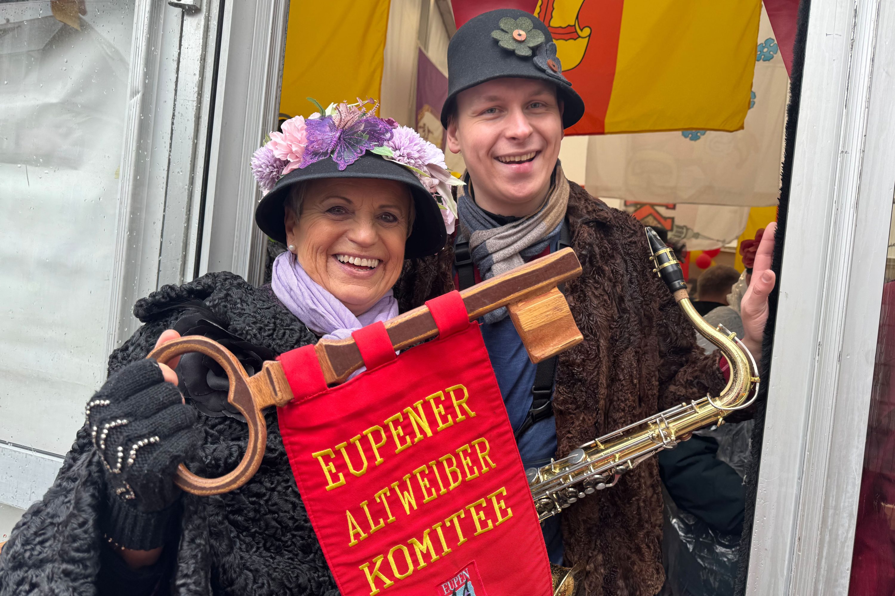 Die Schlüsselübergabe ließ auf sich warten. Doch kurz vor 12 Uhr halten die Au Wiever den Schlüssel endlich in Händen. Und sie haben eine Botschaft an alle Jecken: "Für die jecken Tage, wo so bescheidenes Wetter gemeldet ist, würde ich auf jeden Fall sagen: Frohsinn und Humor hilft in jeder Lebenslage. Auch jetzt und vor allem zu Karneval. Wir machen einfach das Beste draus", ist das Motto von Andrée Leffin-Schoonbroodt.
