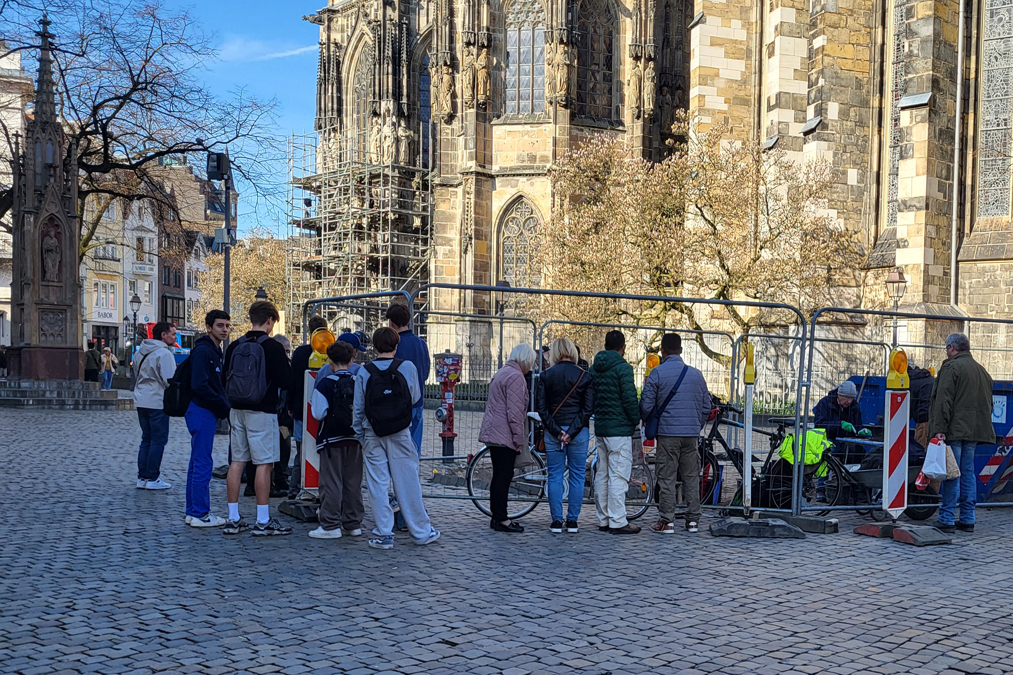 Es wird direkt unter dem Aachener Dom geschaufelt. Dort sind gerade zwei Löcher im Boden, die einen Durchmesser von circa zwei bis drei Metern haben. Meistens in den Löchern zugange sind Stadtarchäologe Andreas Schaub und sein Team aus ehrenamtlichen Helfern.