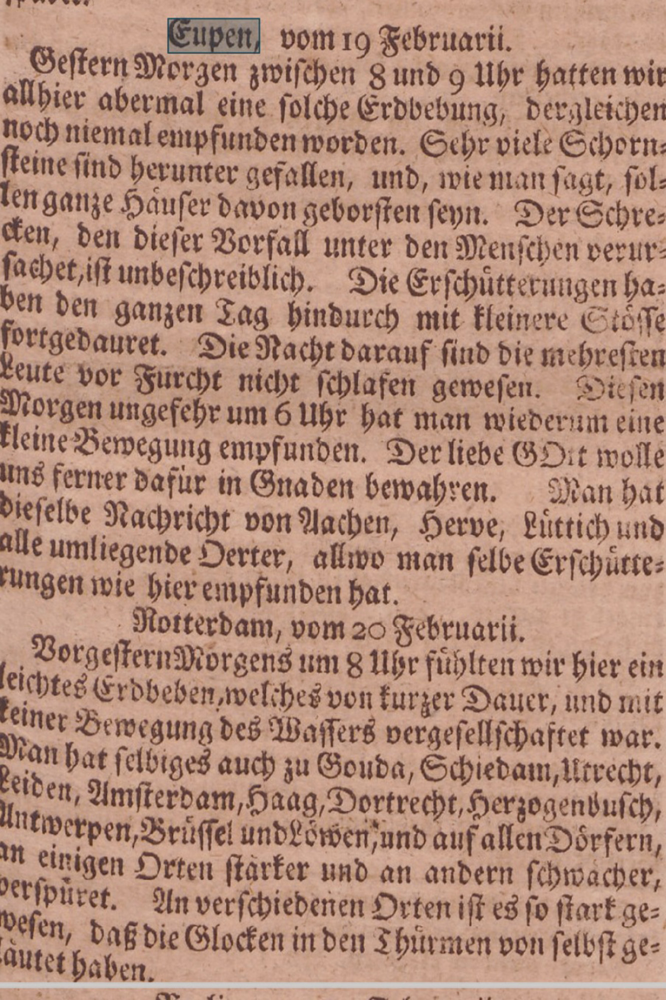 BRF-Hörer Patrick Schumacher hat uns auf den Auszug im "Hamburger Relations-Courier" vom 27. Februar 1756 aufmerksam gemacht. Darin ist von einem sehr starken Erdbeben in Eupen die Rede, das am 8. Februar 1756 zwischen 8 und 9 Uhr stattgefunden habe. "Sehr viele Schornsteine" seien "herunter gefallen". Der Vorfall habe "unter den Menschen einen unbeschreiblichen Schrecken verursacht". Am nächsten Morgen gab es laut Hamburger Relations-Courir ein Nachbeben.