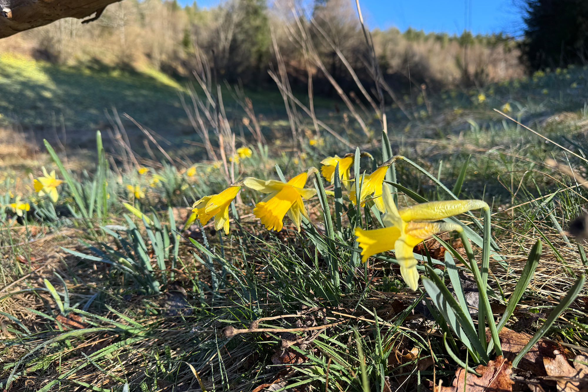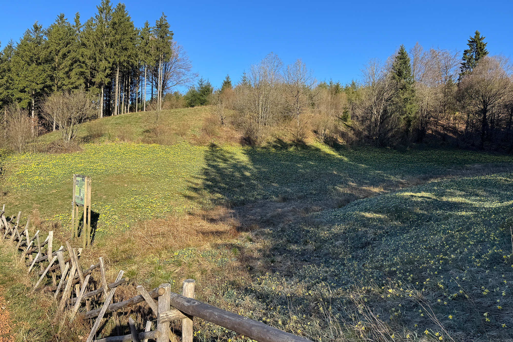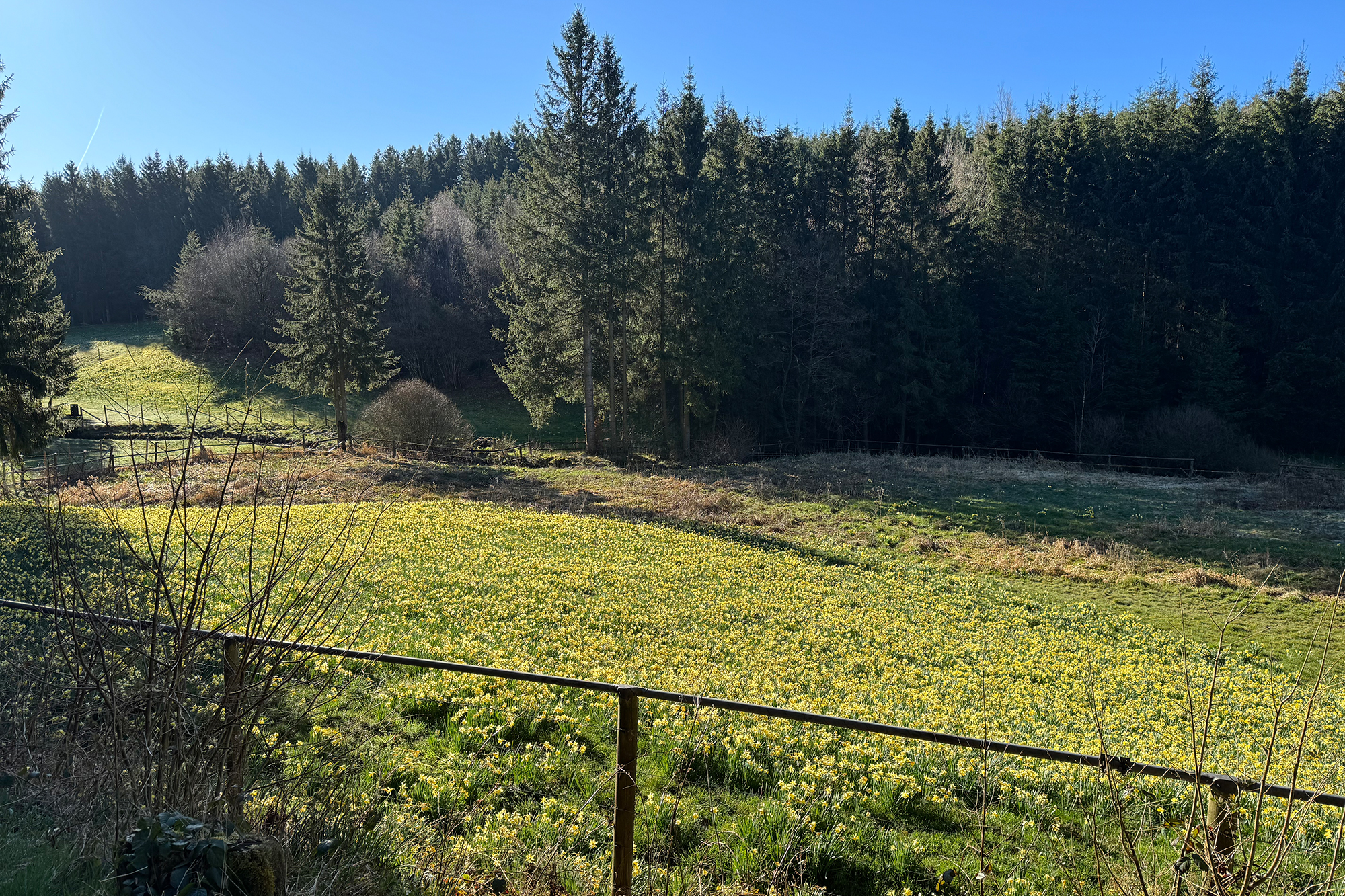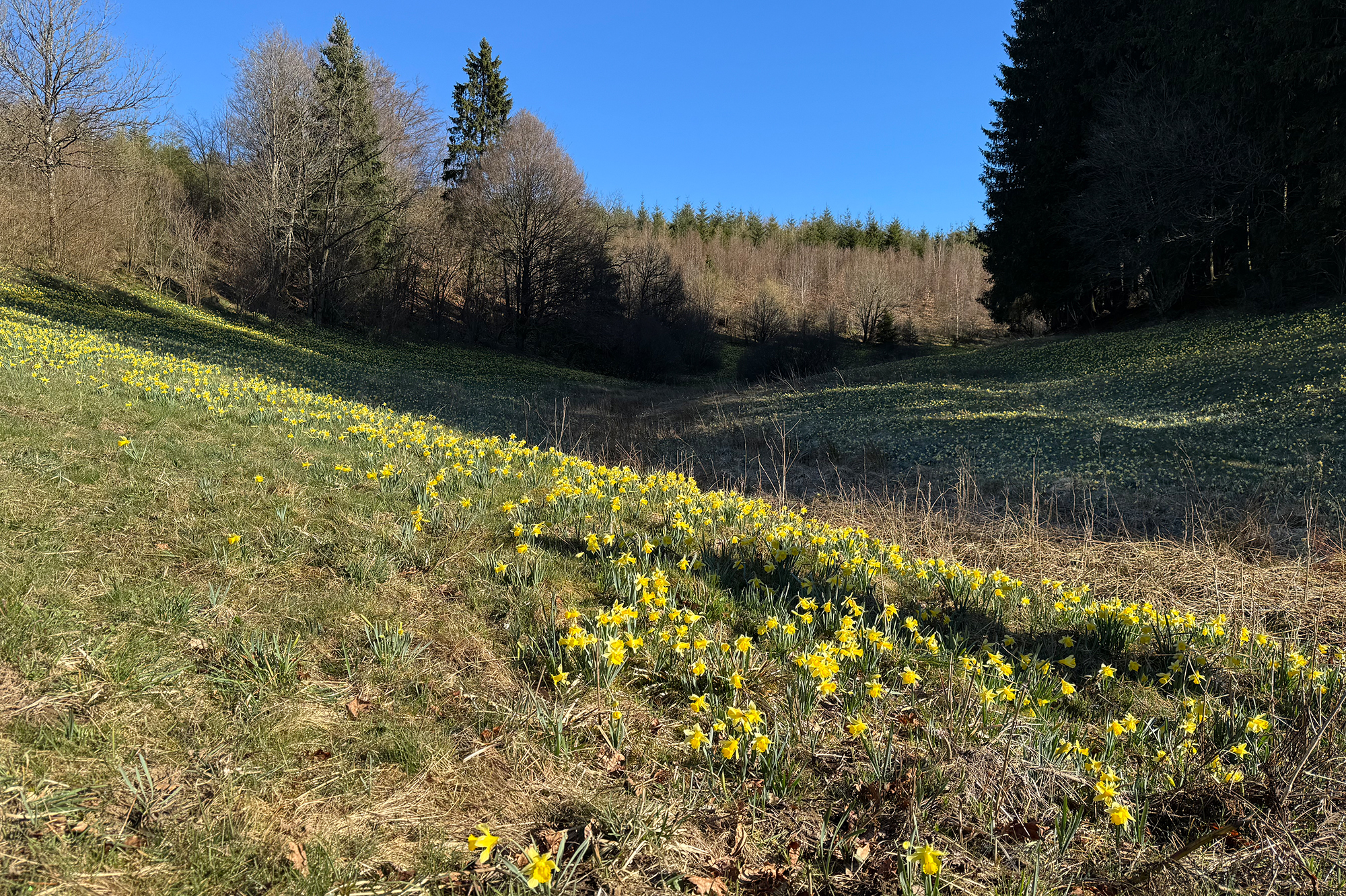 Es ist ein friedlicher Morgen an der Enkelberger Mühle. Wolkenloser Himmel, Frühlingstemperaturen. Die unzähligen Narzissen leuchten im Sonnenschein. Ein Naturschauspiel im Holzwarchetal - jedes Jahr aufs Neue.
