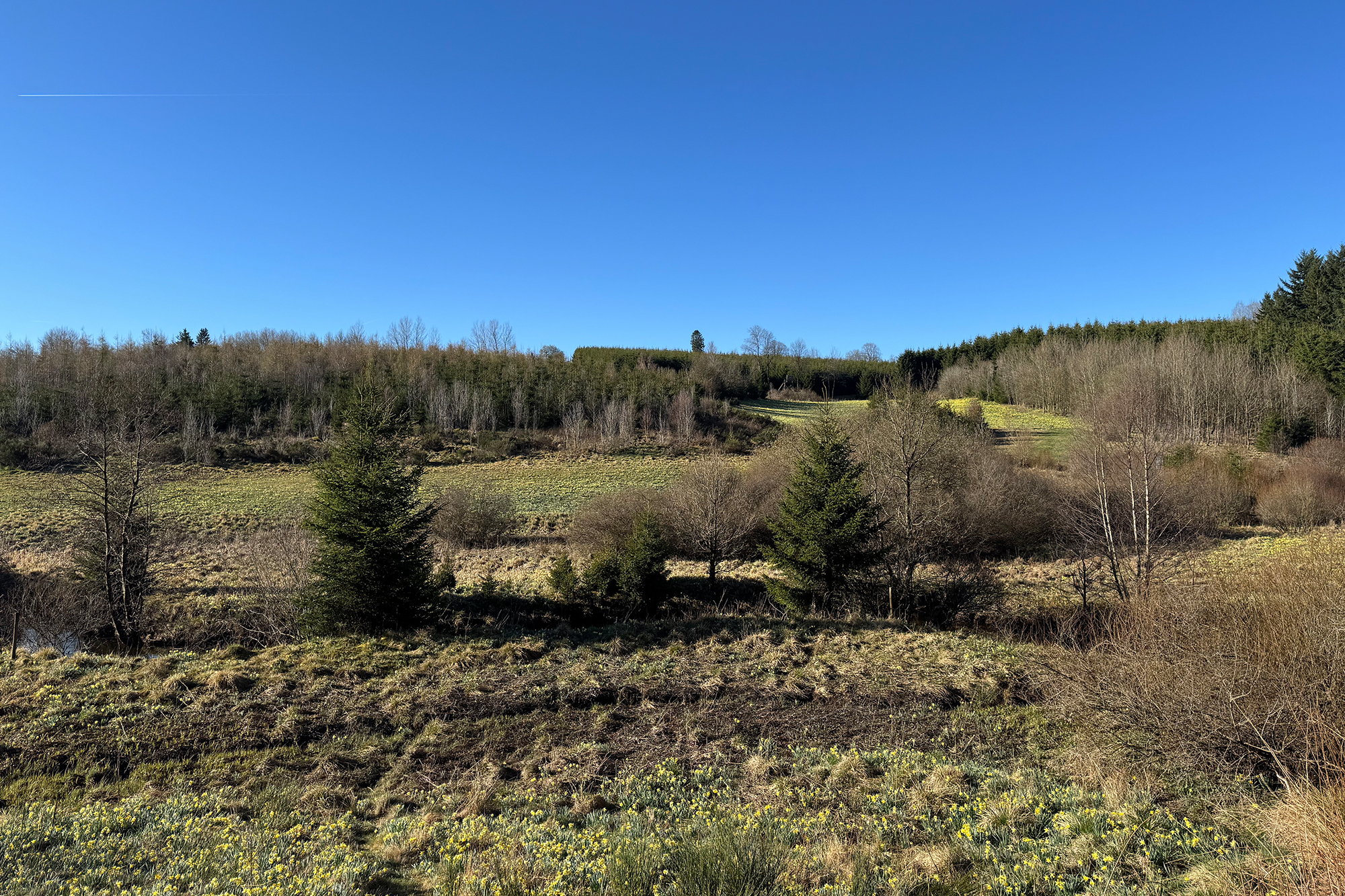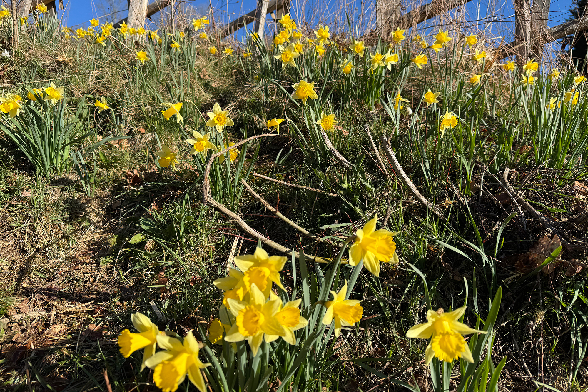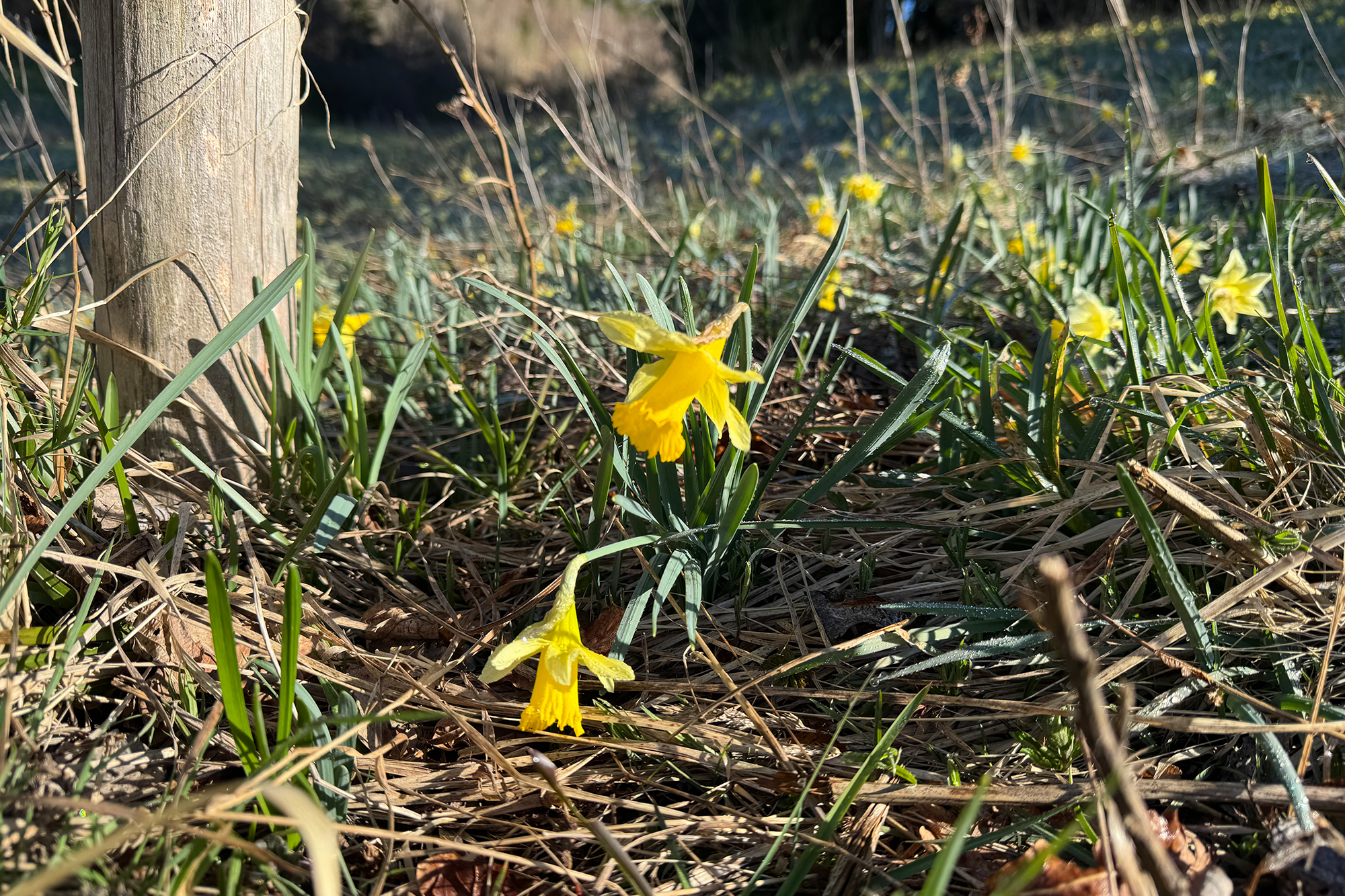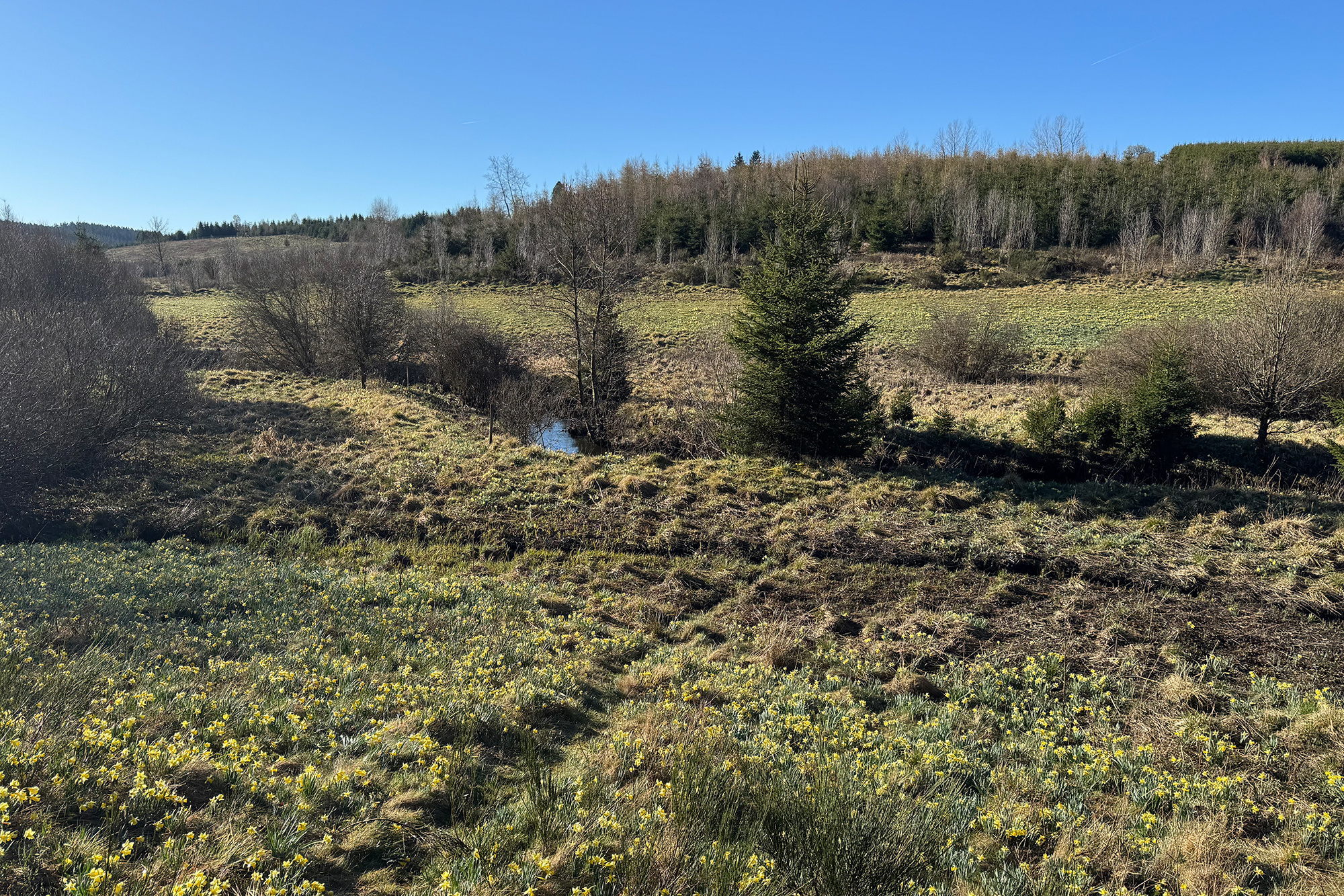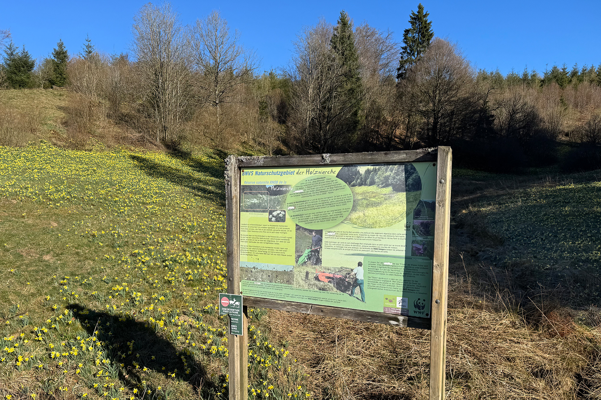 Es ist ein friedlicher Morgen an der Enkelberger Mühle. Wolkenloser Himmel, Frühlingstemperaturen. Die unzähligen Narzissen leuchten im Sonnenschein. Ein Naturschauspiel im Holzwarchetal - jedes Jahr aufs Neue.