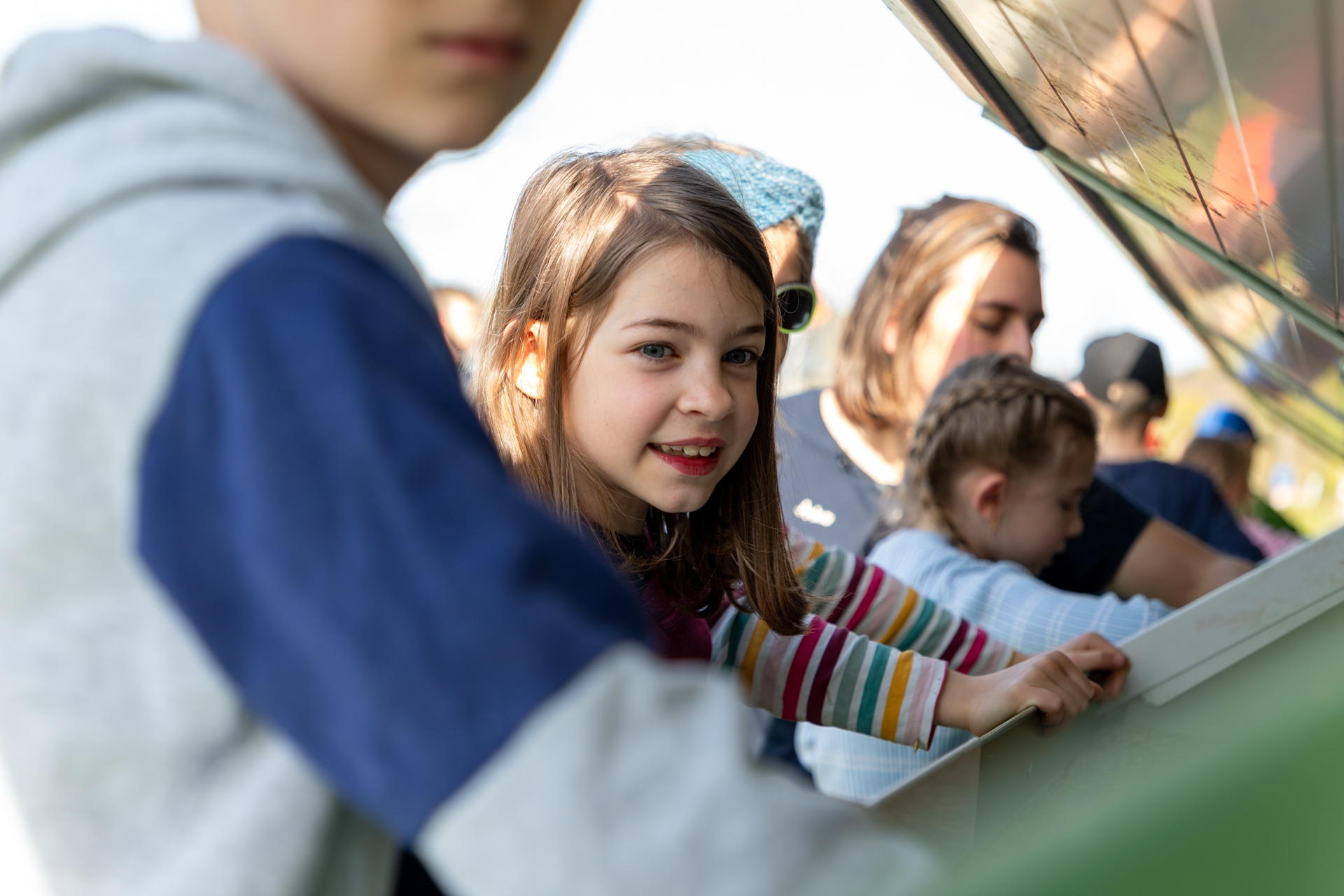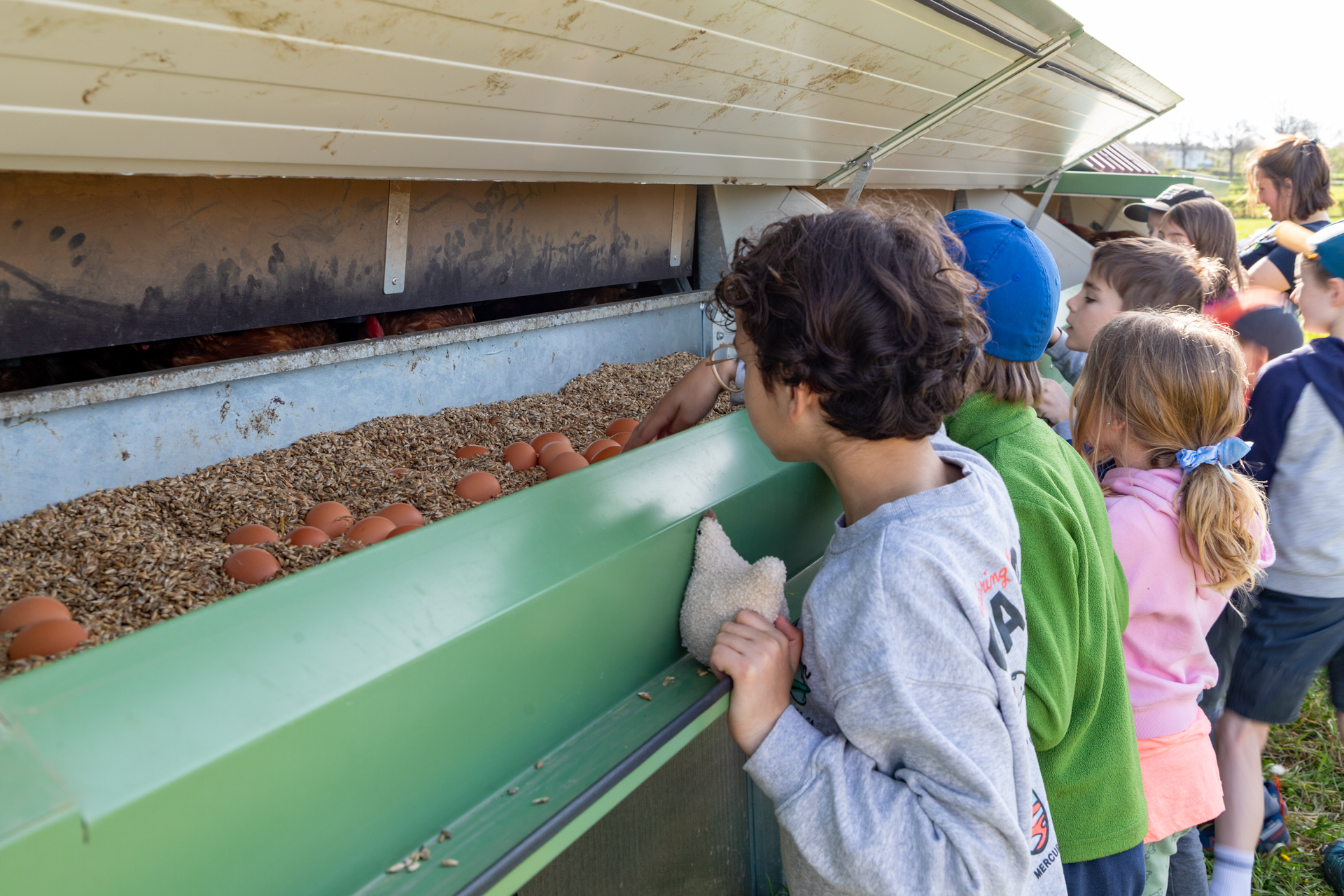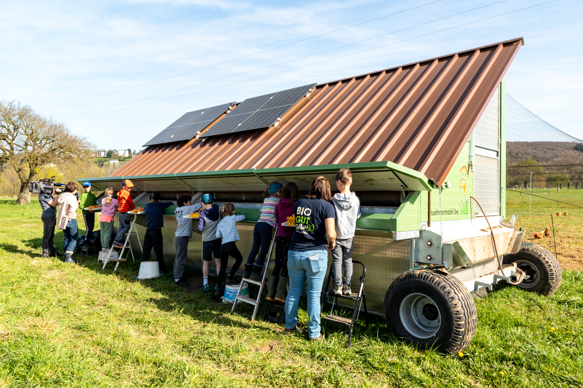 200 Hühner laufen in einem eingezäunten Feld frei herum, scharren und picken. Die Kinder dürfen rein ins Gehege und auch mal ein Huhn streicheln. Anke Filbrich vom Bio Gut Rotter findet diesen Tierkontakt für Kinder sehr wichtig. Zusammen mit ihr entdecken die Kinder auch, wie ein Hühnermobil funktioniert, und sie dürfen die frisch gelegten Eier einsammeln: 191 Stück sind es an diesem Morgen.
