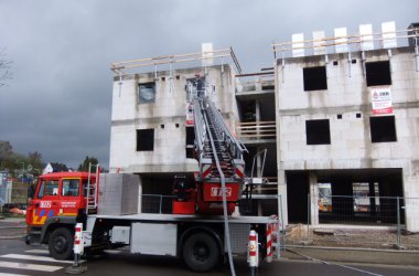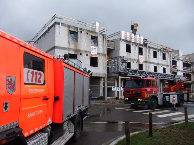 Großalarm in einem Rohbaukomplex gleich neben dem St. Vither Triangel: Durch eine Explosion ist im Obergeschoss ein Brand ausgebrochen, ein Arbeiter wird vermisst. Feuerwehr, Polizei und Rettungsdienst sind sofort zur Stelle ... Gott sei Dank nur das Szenario einer Übung.