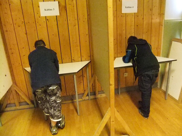 Und sie sind aufgerufen, ihre Klassensprecher zu wählen. Dabei ist alles so, wie man es aus dem Wahlbüro kennt: mit Wahlkabinen, einer Urne für die ausgefüllten Wahlzettel, dem Stempel auf den Wahlaufforderungen - bis hin zu den belegten Brötchen für die Beisitzer im Wahlbüro.