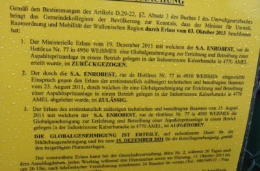Die Anwohner wollen nun erneut vor dem Staatsrat klagen, damit die neue Globalgenehmigung ausgesetzt und aufgehoben wird. Gerhard Mertes, Präsident der Bürgerinitiative Kaiserbaracke, undseine Mitstreiter sind weiterhin fest entschlossen, gegen die genehmigte Asphaltsplittzentrale vorzugehen. Die Bürgerinitiative hofft dabei wieder auf die Unterstützung der Gemeinde Amel. In einem Gespräch habe Amels Bürgermeister Klaus Schumacher gestern erklärt, dass er dazu erst das Einverständnis des Gemeinderats einholen müsse.