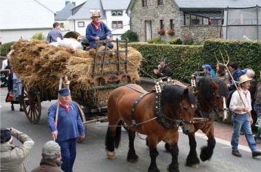 Neben Pferde- und Ochsengespannen sind auch Scherenschleifer und Kesselflicker dabei, Feldarbeiter, Volksschüler samt Schulmeister, Oldtimer-Traktoren sowie Folkloretanzgruppen aus Hinderhausen, Bitburg und Piesbach.
