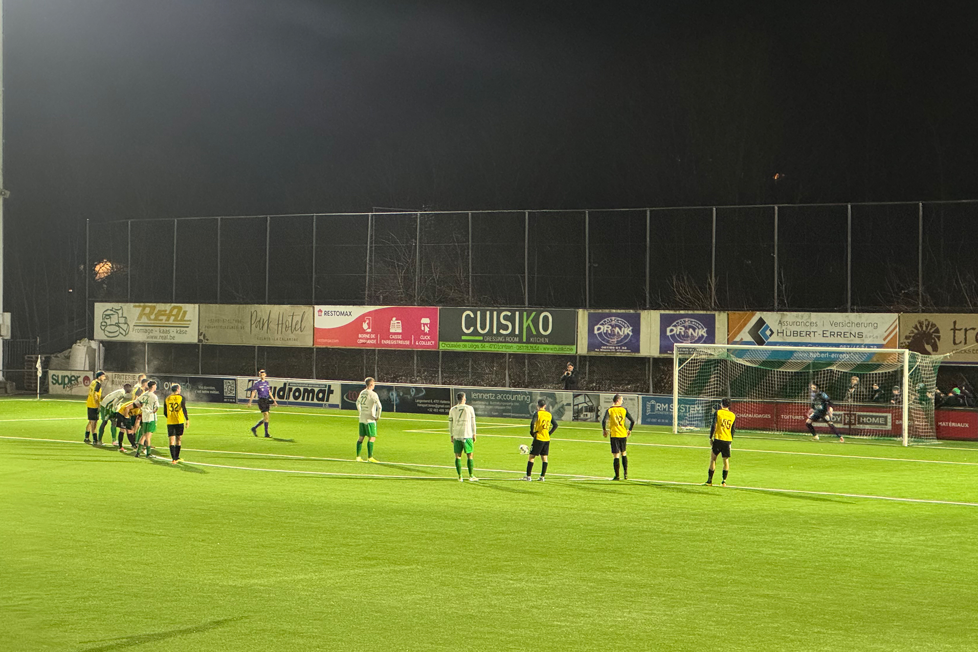 Aus Sicht der Schwarz-Gelben begann die Partie denkbar ungünstig. Bereits in der ersten Halbzeit kassierte Raeren zwei Gegentreffer: Nach einem Handspiel im Strafraum verwandelte Bastien Hungs den fälligen Elfmeter zur 1:0-Führung für die Union Kelmis (23.). Nur sieben Minuten später erhöhte William Belle mit einem sehenswerten Distanzschuss auf 2:0.