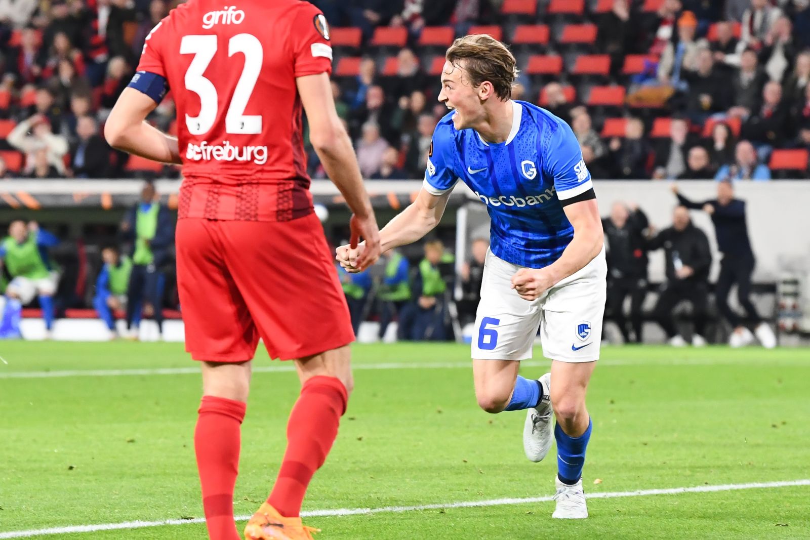 Vor 35.000 Zuschauern, darunter rund 2.000 mitgereiste Anhänger des KRC Genk, begann das Achtelfinal-Rückspiel beim SC Freiburg aus Sicht der Limburger denkbar ungünstig. Genk fand zunächst überhaupt keinen Zugriff auf die Partie, ließ sich tief in die eigene Hälfte drängen und hatte große Probleme, die druckvollen Angriffe der Hausherren zu kontrollieren. Freiburg dominierte die Anfangsphase klar und nutzte seine Überlegenheit folgerichtig zur Führung: Nach einer präzisen Freistoßflanke von Vincenzo Grifo war Matthias Ginter zur Stelle und köpfte zum 1:0 ein.
