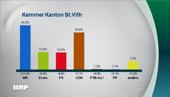 Bei der vergangenen Wahl für die Kammer war die PS noch stärkste Kraft im Kanton St. Vith, jetzt ist sie auf Rang drei abgerutscht. MR und CDH legen deutlich zu. Die Zahl der Weiwähler für die Kammer im Kanton St. Vith liegt jetzt über 20 Prozent