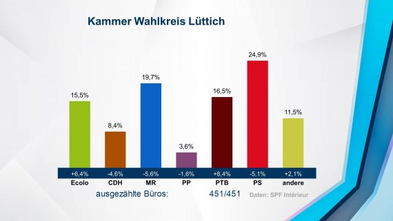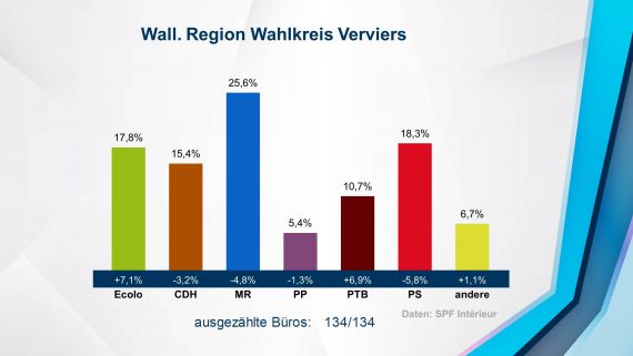 Im französischsprachigen Landesteil haben Ecolo und PTB sowohl bei den Regional- als auch bei den Föderalwahlen deutliche Erfolge erzielt. PS und MR hingegen mussten Verluste verbuchen, zählen aber in allen Parlamenten weiter zu den drei stärksten frankophonen Parteien dazu. Die CDH büßte ebenfalls Stimmen ein, konnte die Verluste allerdings noch in Grenzen halten.