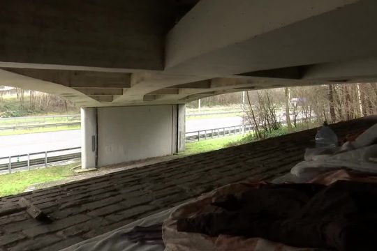 Eine Autobahnbrücke zwischen Welkenraedt und Elsaute wird von Migranten als Zwischenstopp auf dem Weg nach England genutzt. Sie schlafen unter der Brücke der Autobahn E40 und hoffen darauf, in einen Lastwagen steigen zu können.