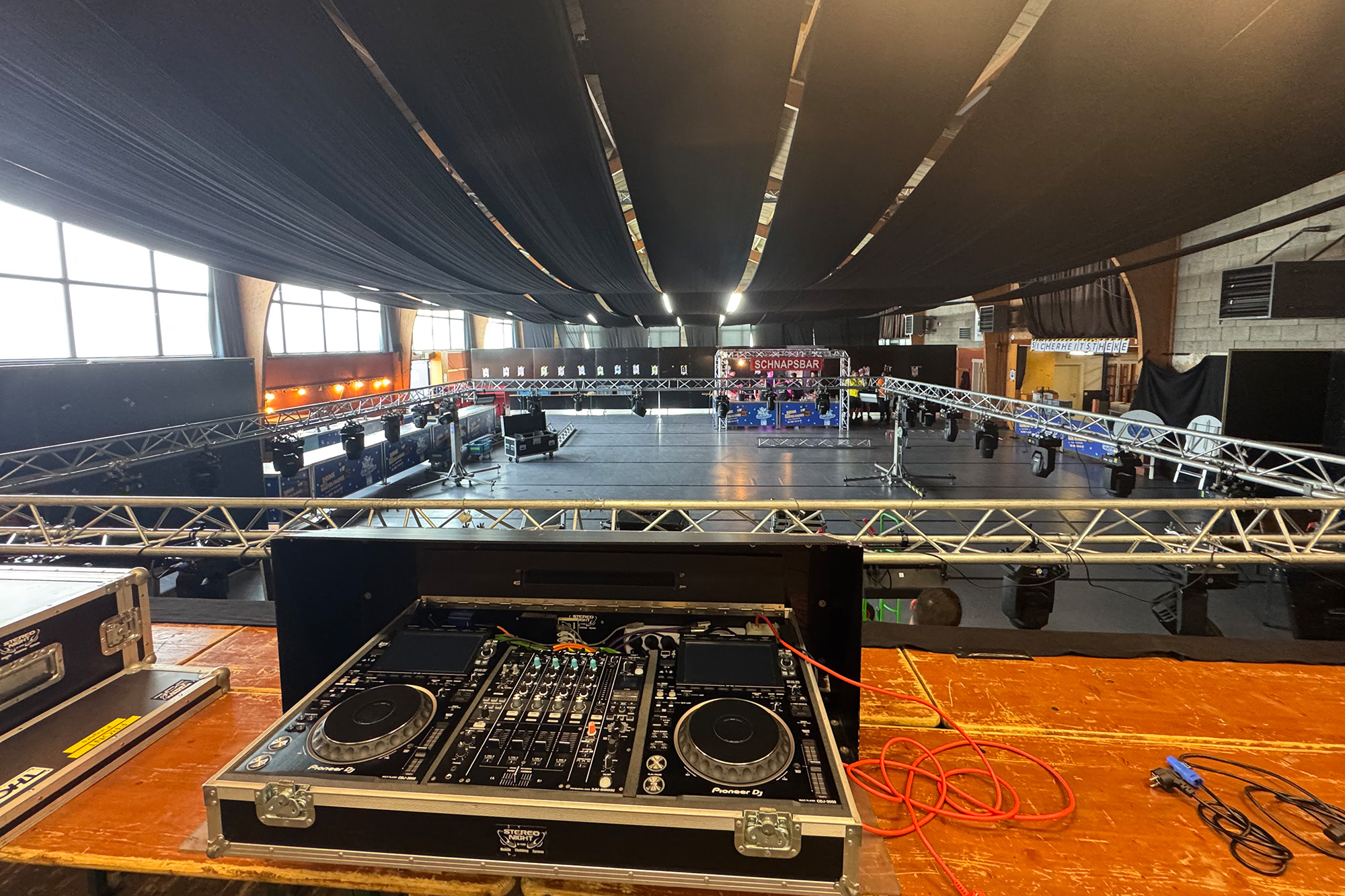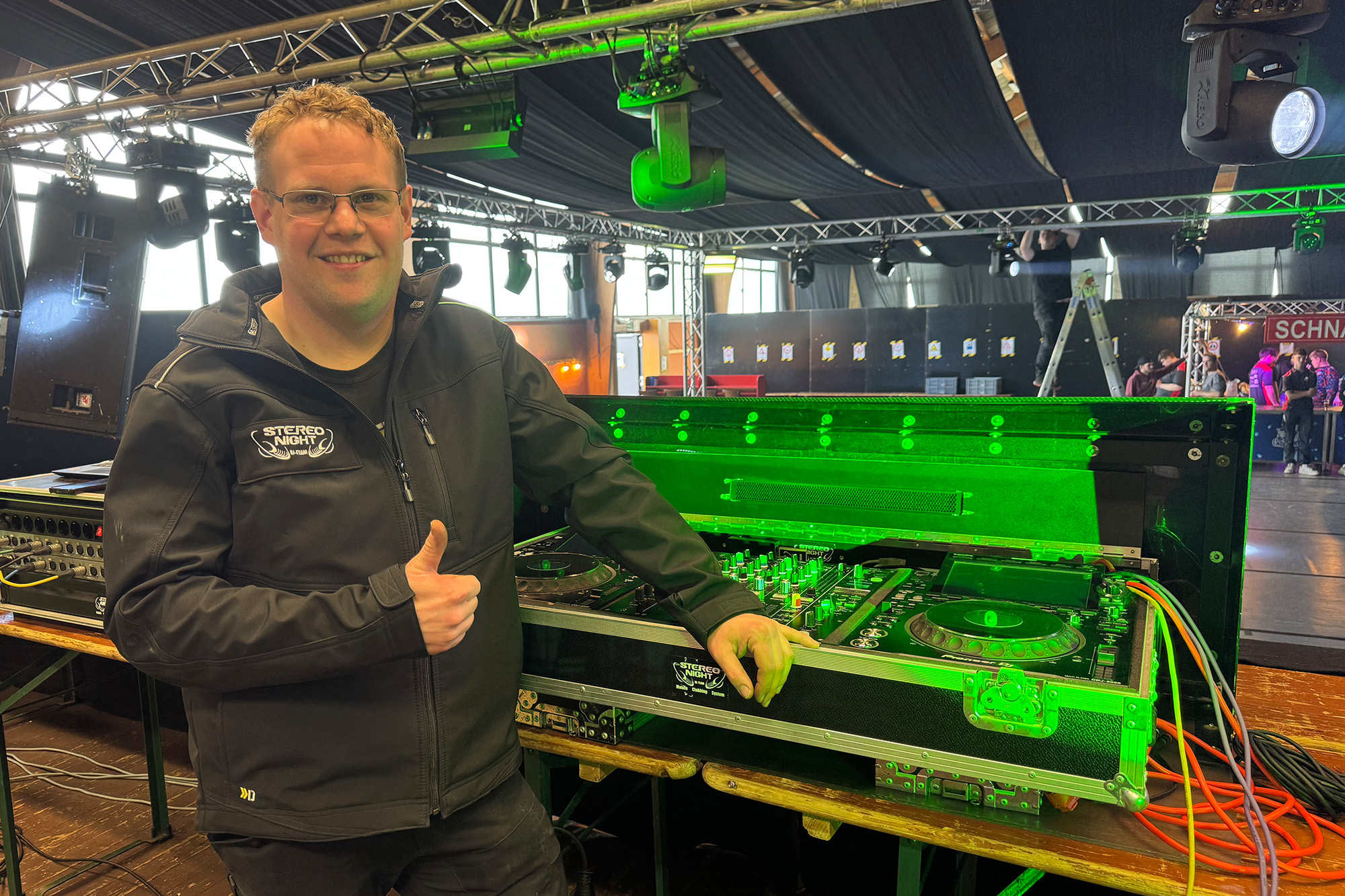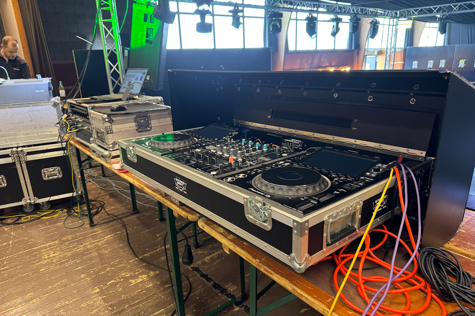Kurz darauf rollt DJ Dominik Jousten mit seinem LKW an. Im Gepäck hat er alles, was für eine gelungene Party nötig ist: eine große Soundanlage, zahlreiche Lichteffekte, Gerüstteile und jede Menge Kabel.